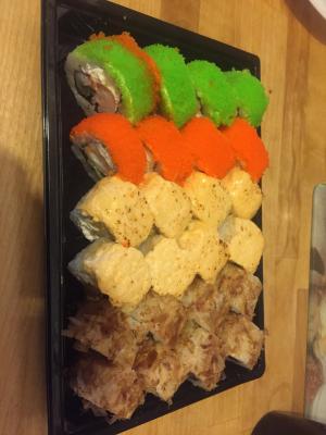 - ролл с опаленным окунем сверху, сладкий перец, сливочный сыр, кисло-сладкий соус, нори, рис (8 шт)