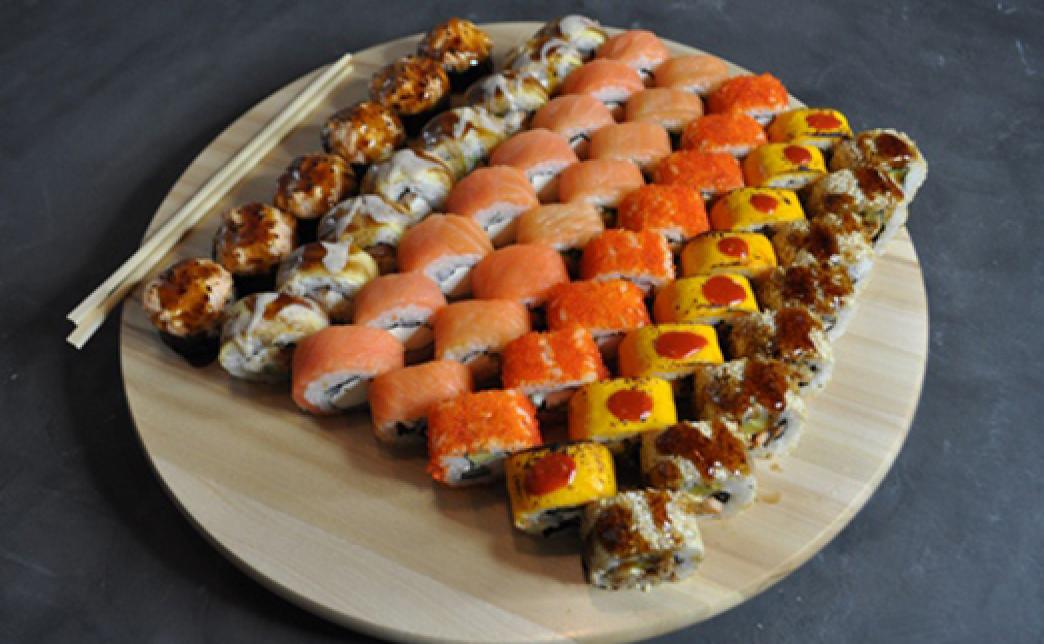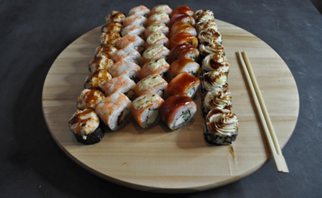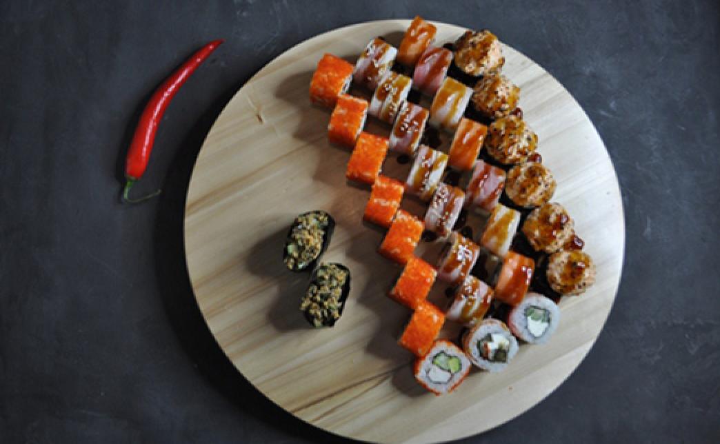 - ролл 1 (креветка, окунь, сыр креметте, омлет томаго, сырный соус, рис, нори)