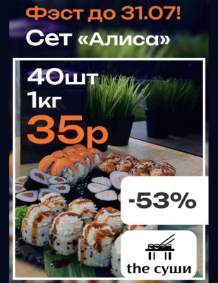 - Промокод дает право на скидку до 58% на суши-сеты от "THE СУШИ"