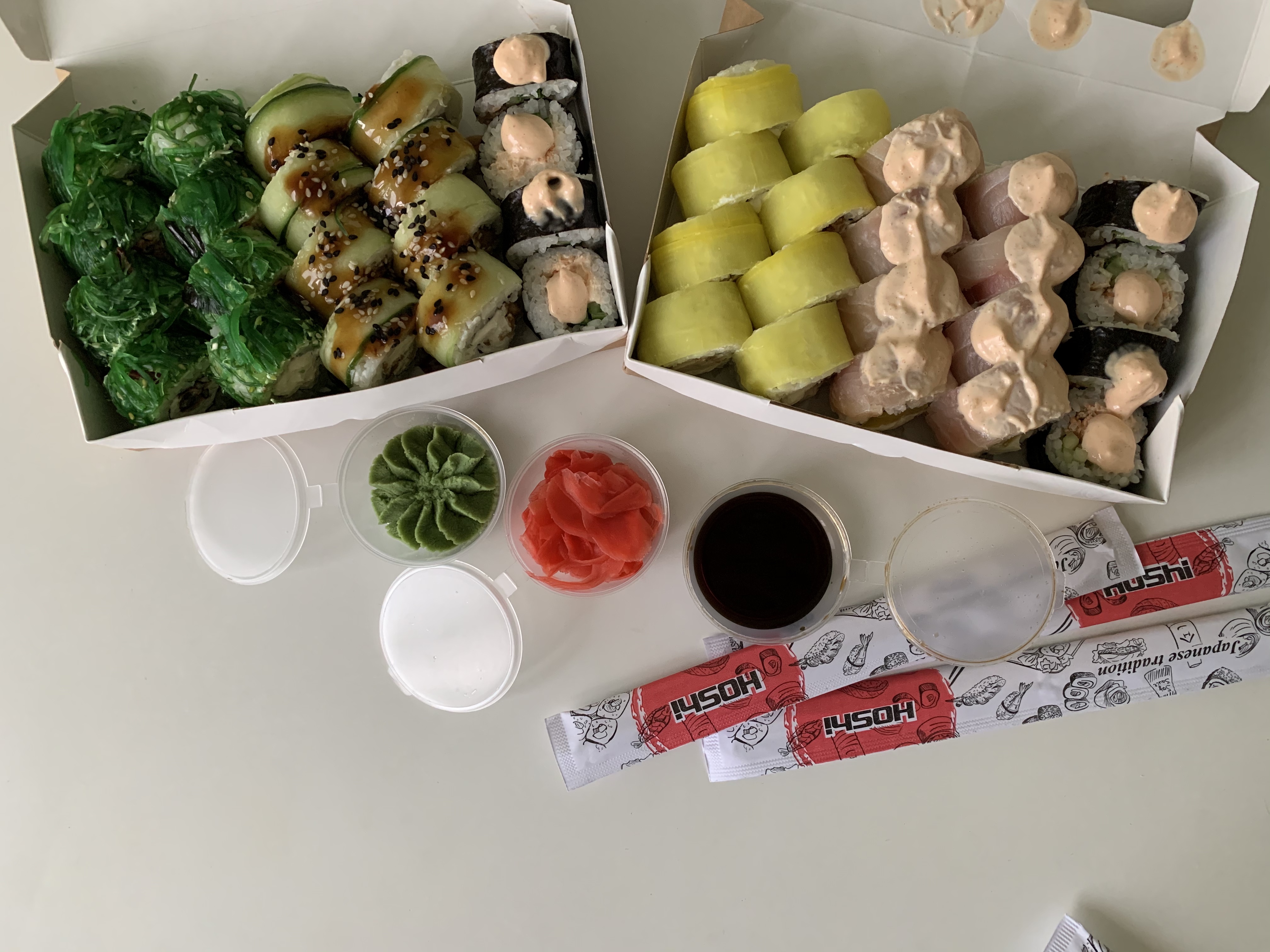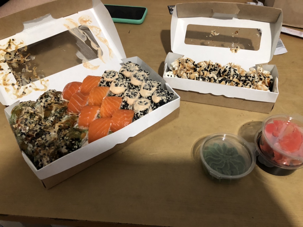 Оперативно заказал, привезли в течение полутора часов. Упаковка отличная, оплата можно картой и налом. Соус , вассаби, имбирь есть Но что разочаровало - рыбы просто почти нет. Один сыр. За это 2 из 5. Это был "Норм сет" - название.