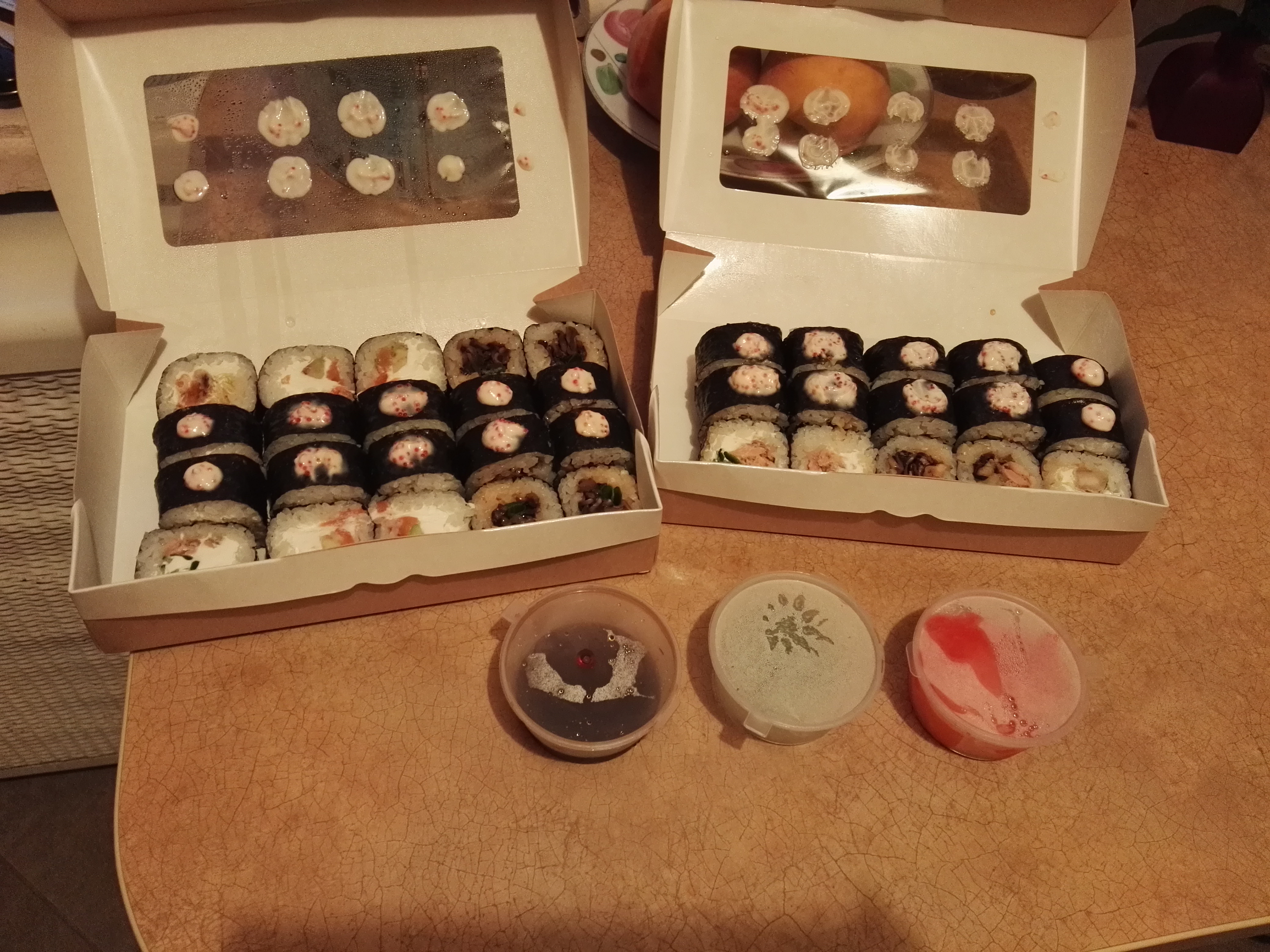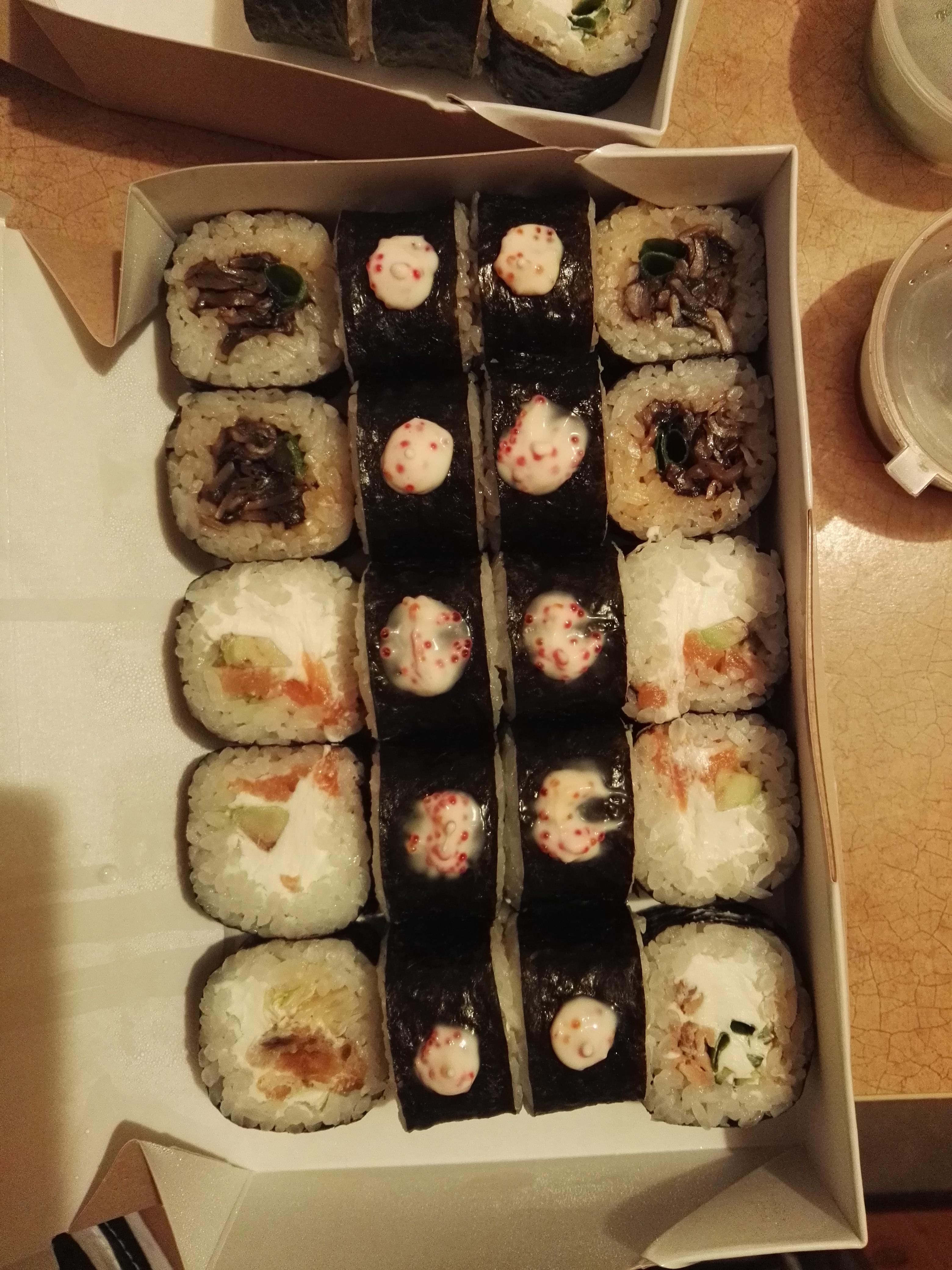 Но с оплатой вообще трэш. Привезли суши на 10 минут позже крайнего времени, ну да это ладно. При оплате картой (об этом было предупреждено во время заказа по телефону) возникли проблемы. Очень долго проводился платёж - и в итоге отказано. При повторной попытке села батарея в терминале, а второго не было. Налички достаточно не было, курьер пошёл подзарядить терминал. Пришёл минут через 10 со шнуром, брали мою зарядку от телефона, заряжали терминал от розетки в квартире. Со второй попытки после подзарядки прошла оплата. Чек об оплате курьер тоже не смог распечатать.