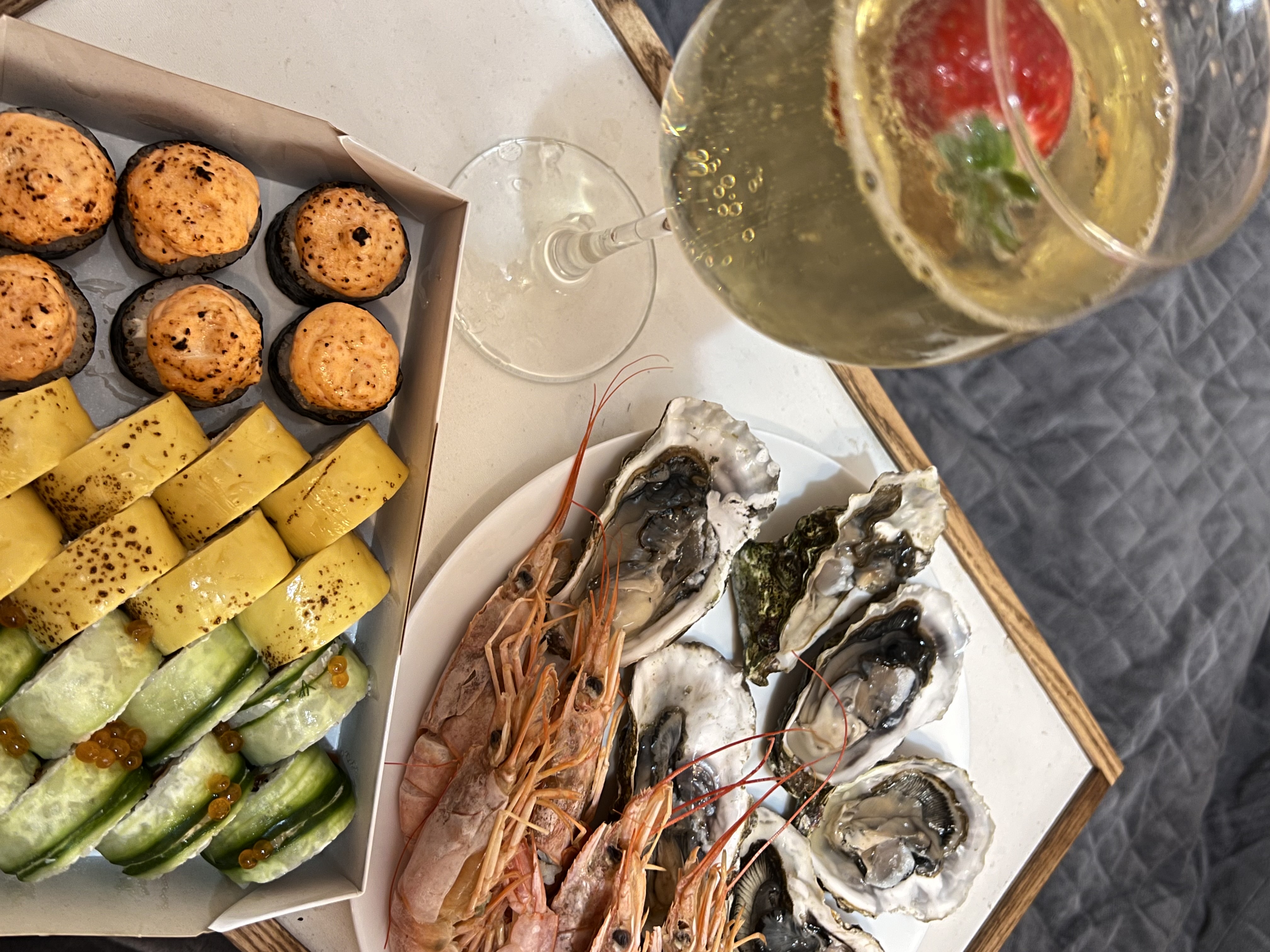 - тунец, гребешок, сливочный сыр, вяленый томат, огурец - 8 шт