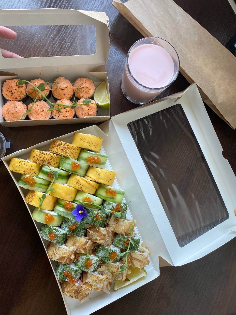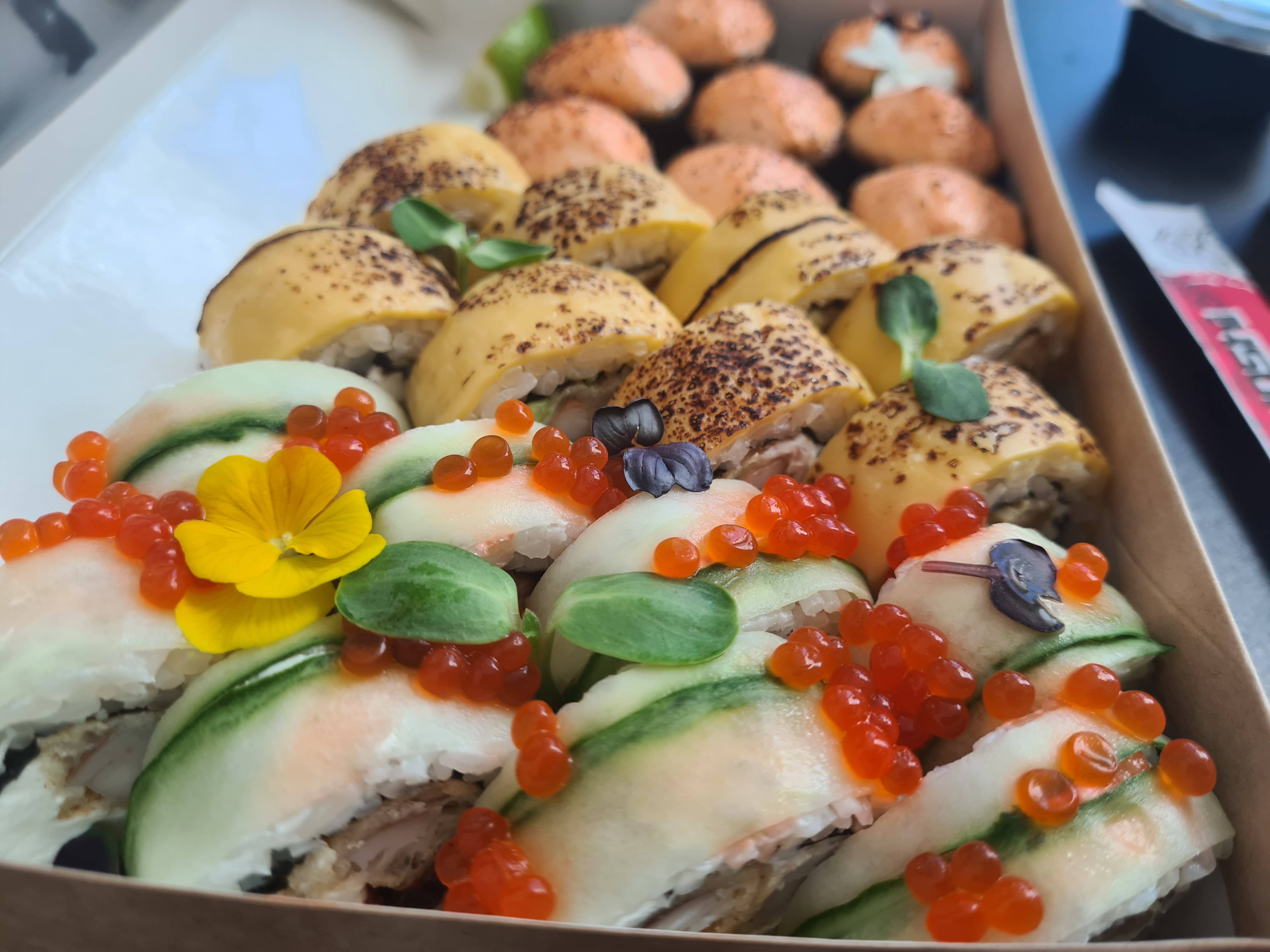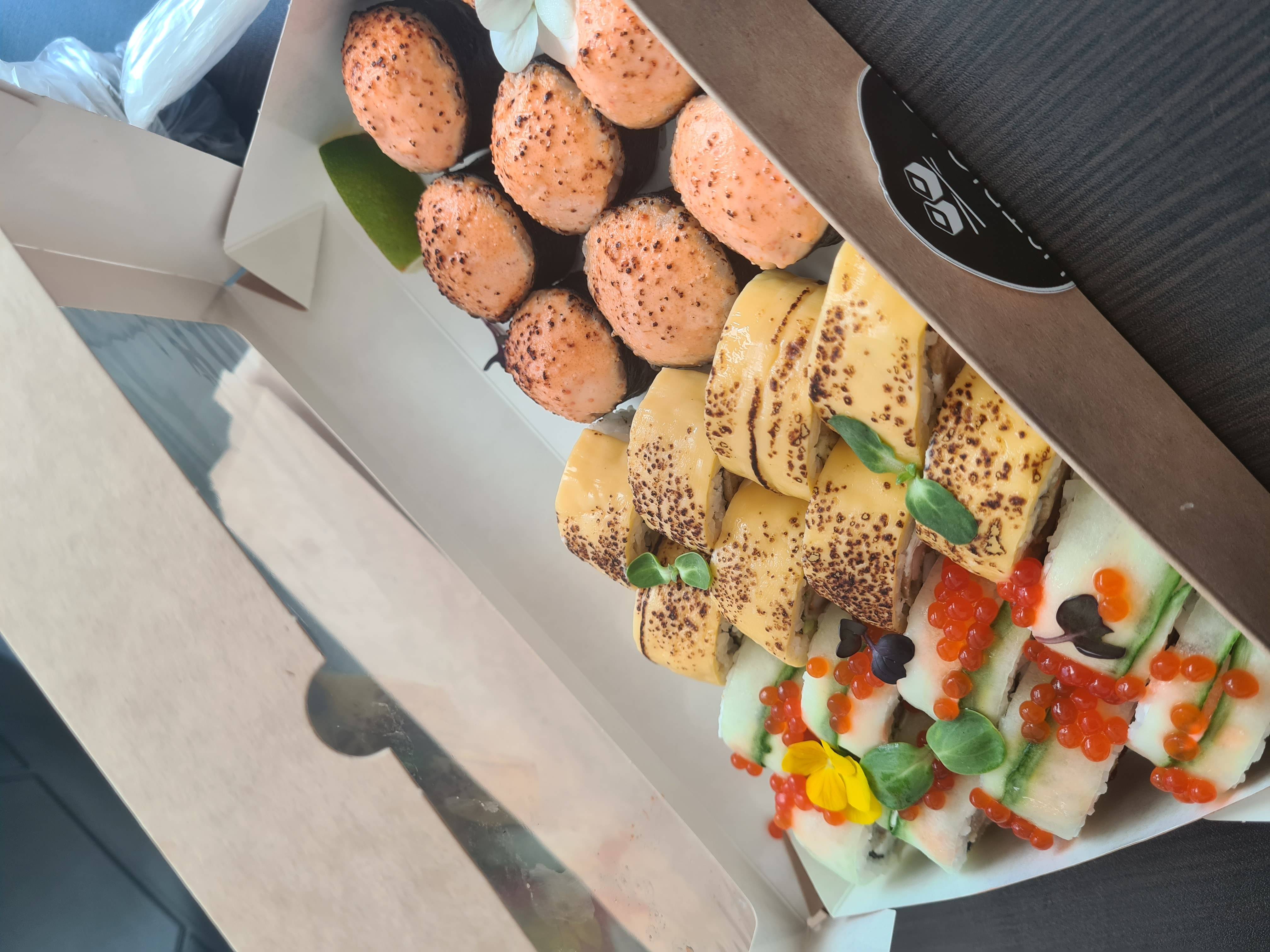 - копченый лосось, сливочный сыр, огурец, японский омлет - 8 шт