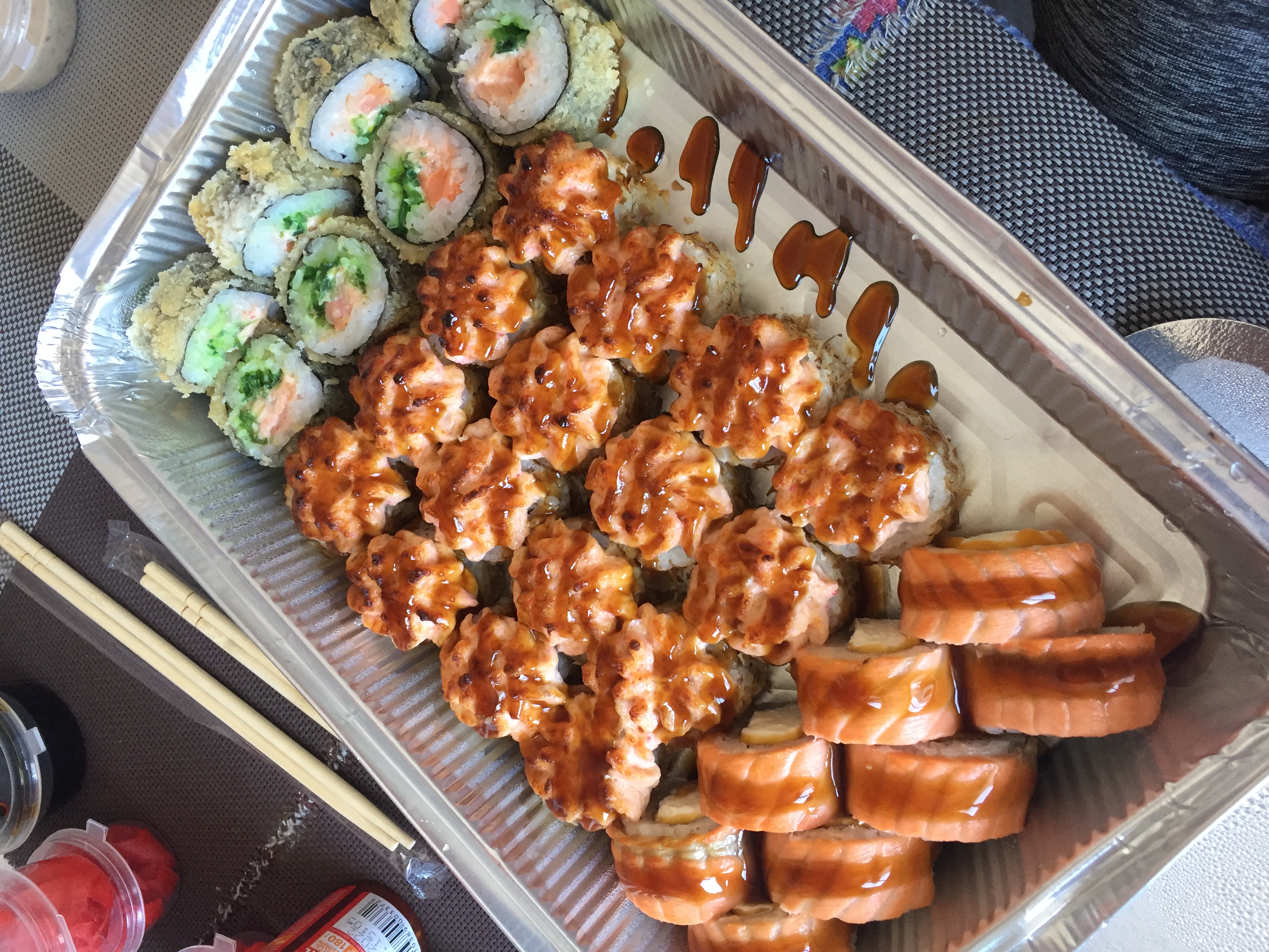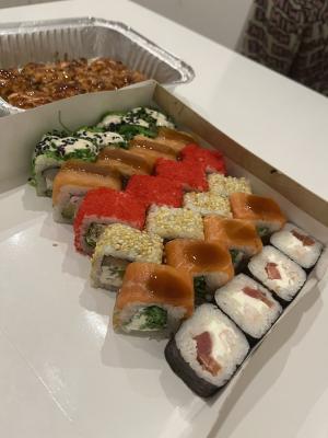 - тай маки (рис, нори, сыр филадельфия, угорь п/копч, такуан, лосось п/копч) - 4 шт.
