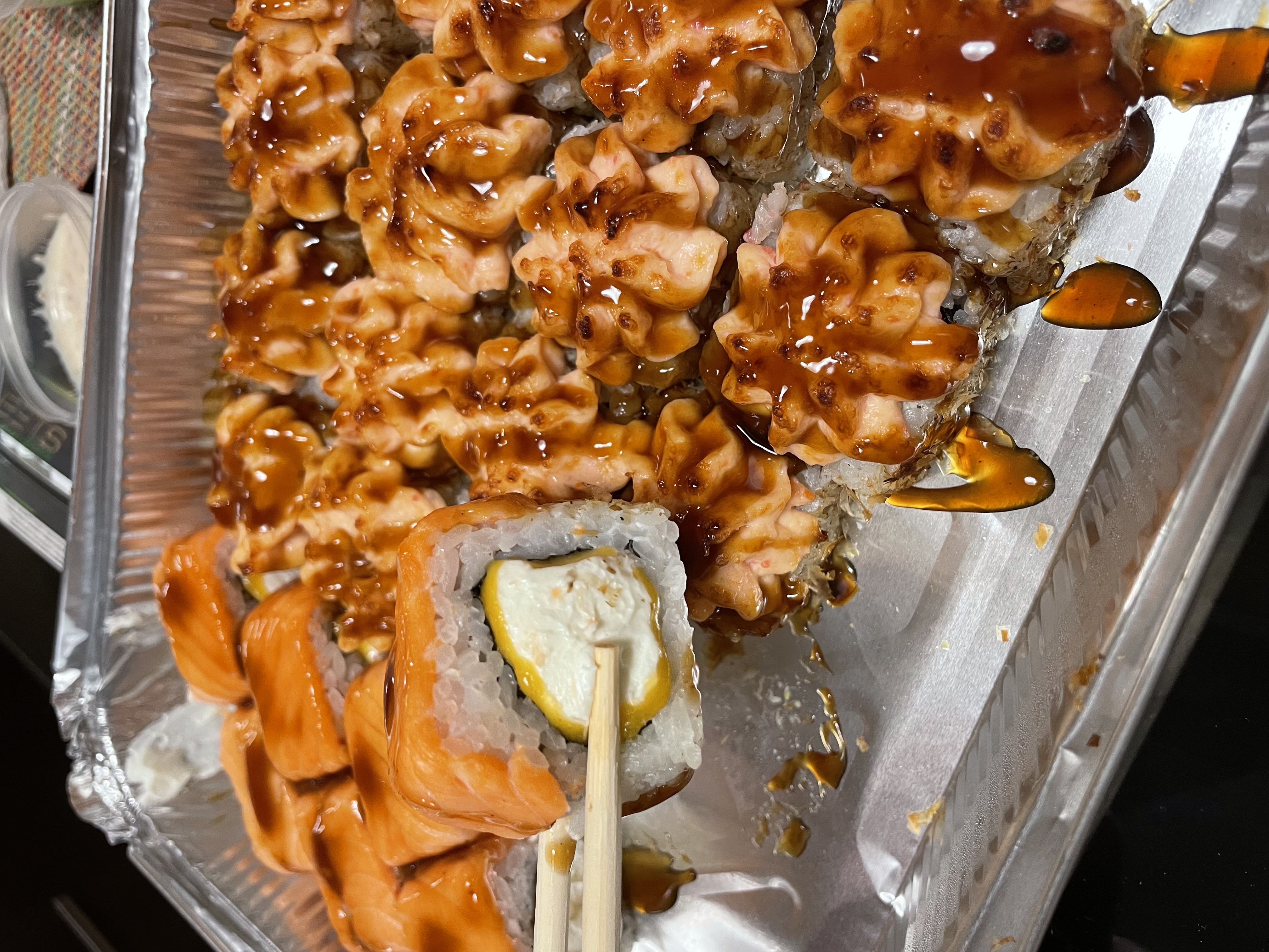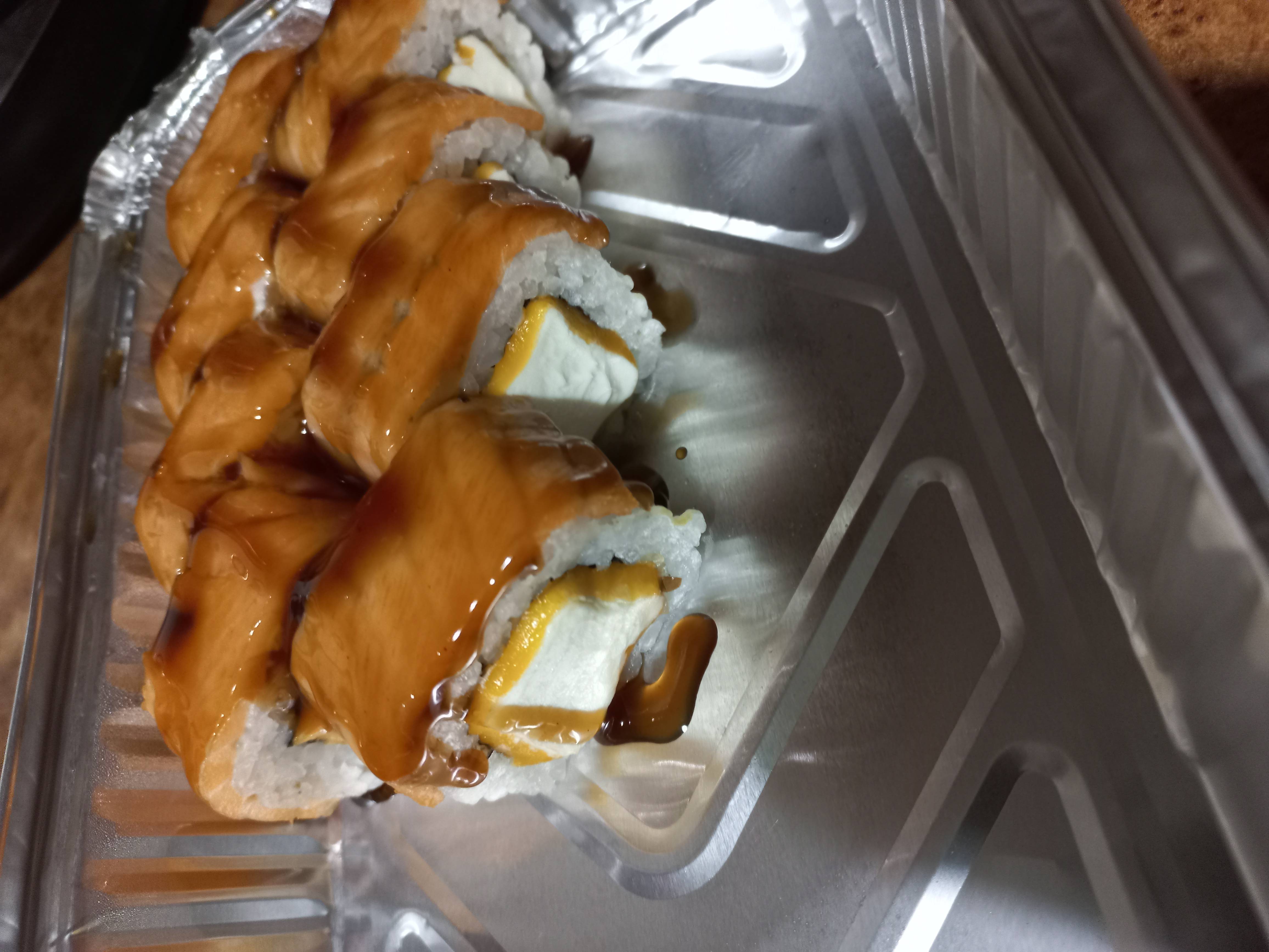 - ролл запечённый классик (рис, нори, сыр филадельфия, лосось, сыр чеддер, соус унаги) - 8 шт.