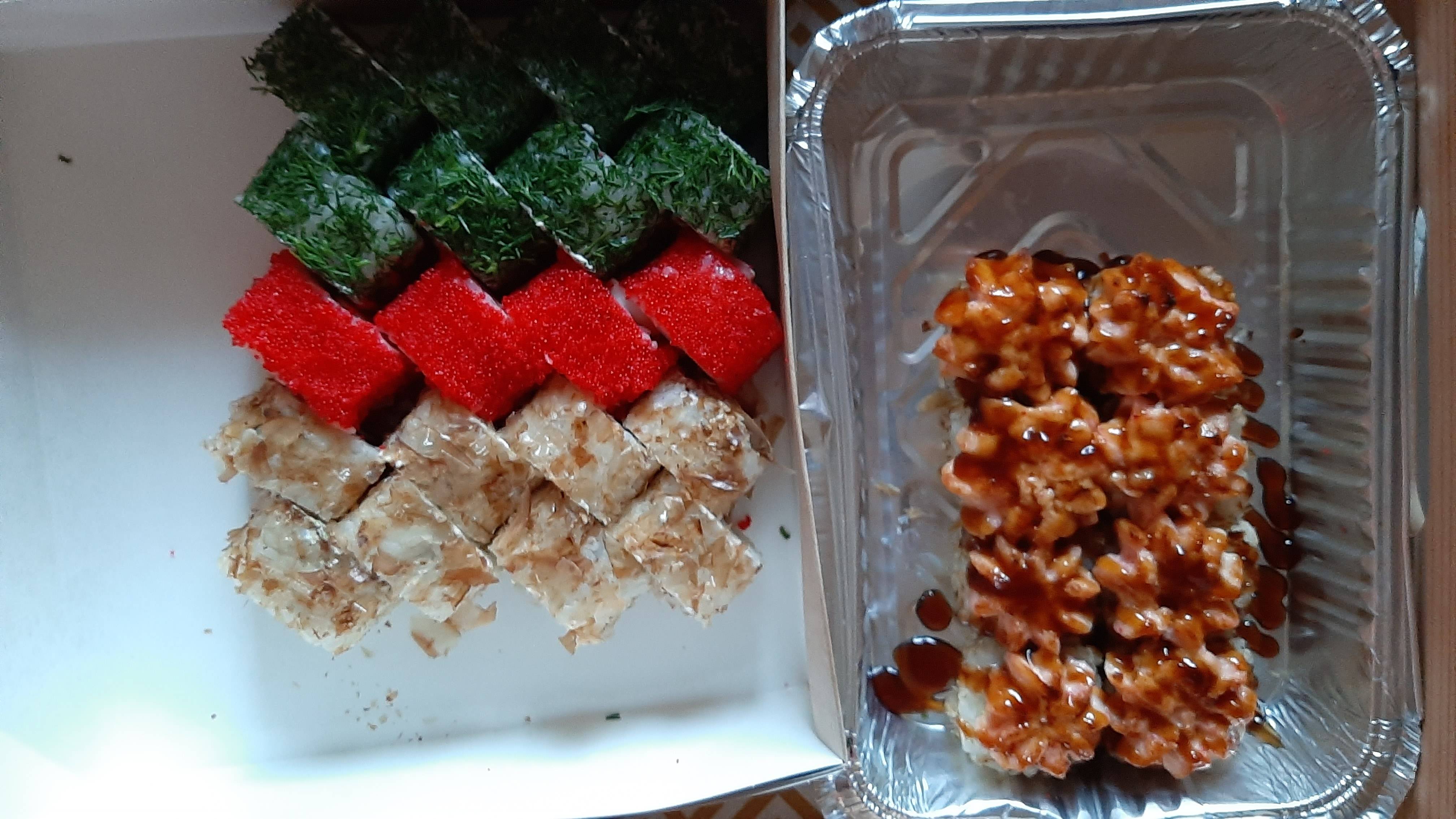 - тануки маки (рис, нори, угорь п/копч, салат, икра тобико, лосось) - 4 шт.