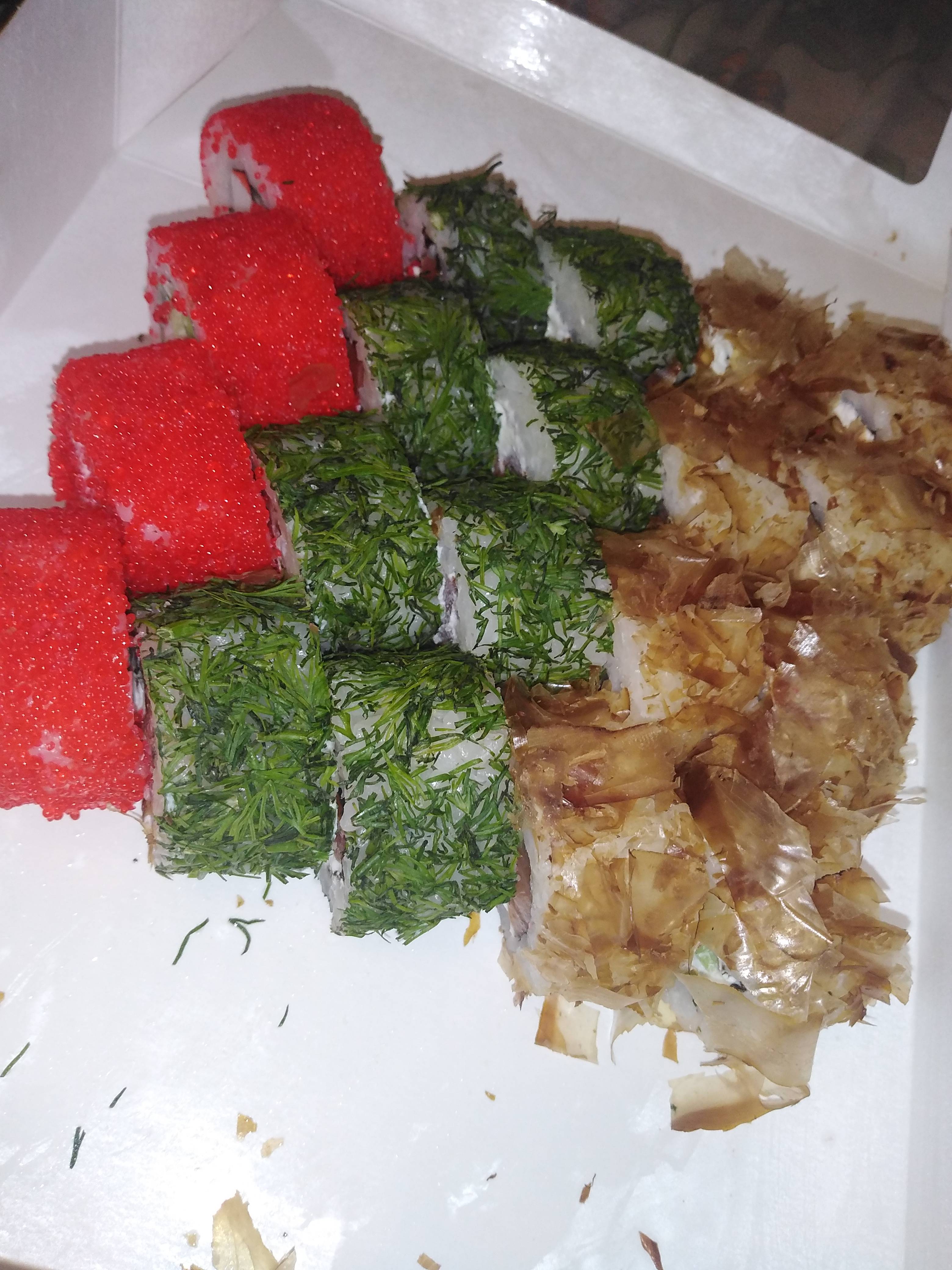 - кацио-буши маки (рис, нори, лосось, сыр филадельфия, огурец, лук зелёный, сыр филадельфия, стружка тунца) - 4 шт.