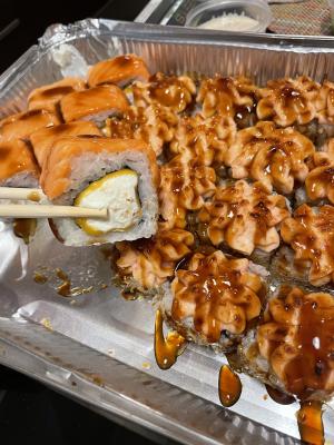 - ролл запеченный с жаренным лососем в соусе терияке (рис, нори, лосось жар. в соусе терияке, тамаго, помидор св., соус сырный, соус унаги, стружка тунца) - 8 шт.