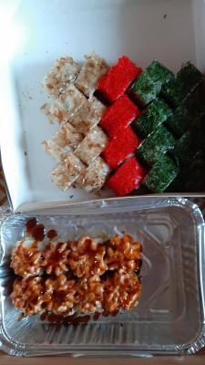 - Гарниры в подарок! Соевый соус (1 шт) + имбирь (1 шт) + васаби (1 шт)