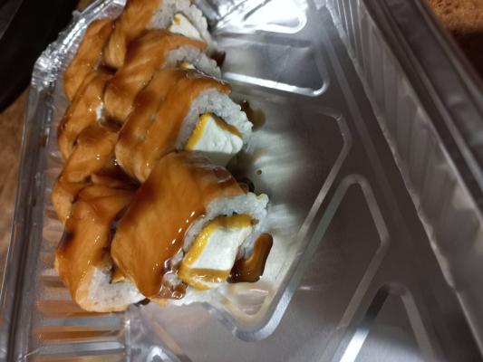- ролл запеченный с курицей и такуаном (рис, нори, сыр aиладельфия, филе куриное, такуан, сырный соус, соус унаги, стружка тунца) - 8 шт.
