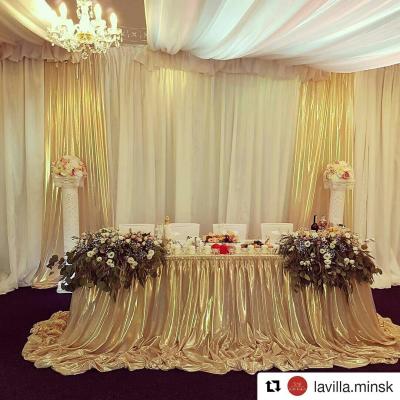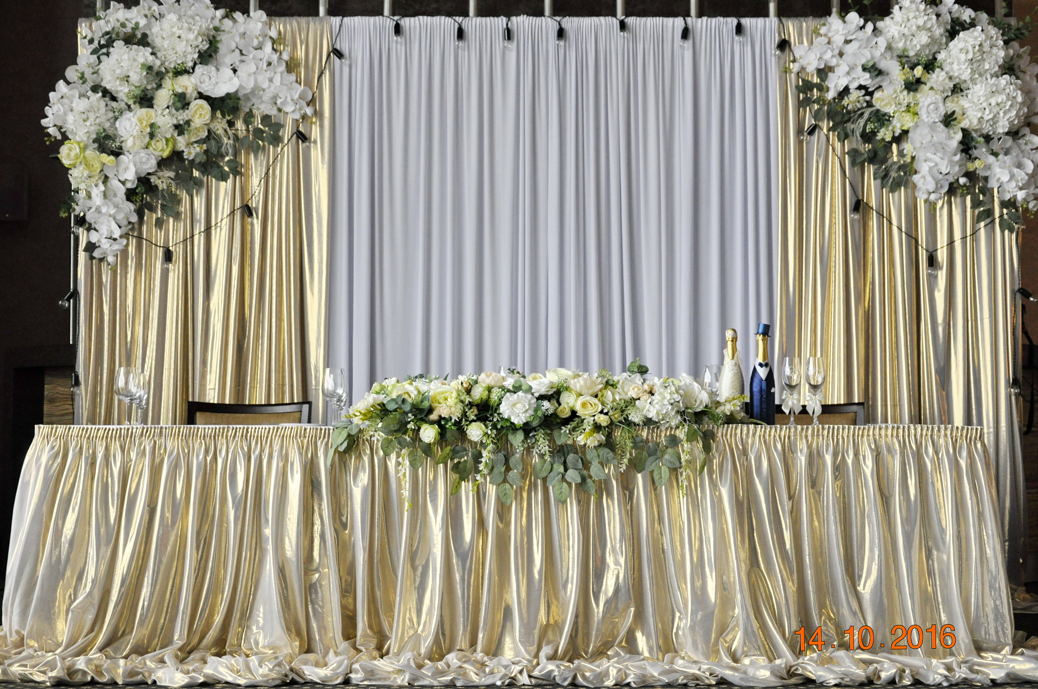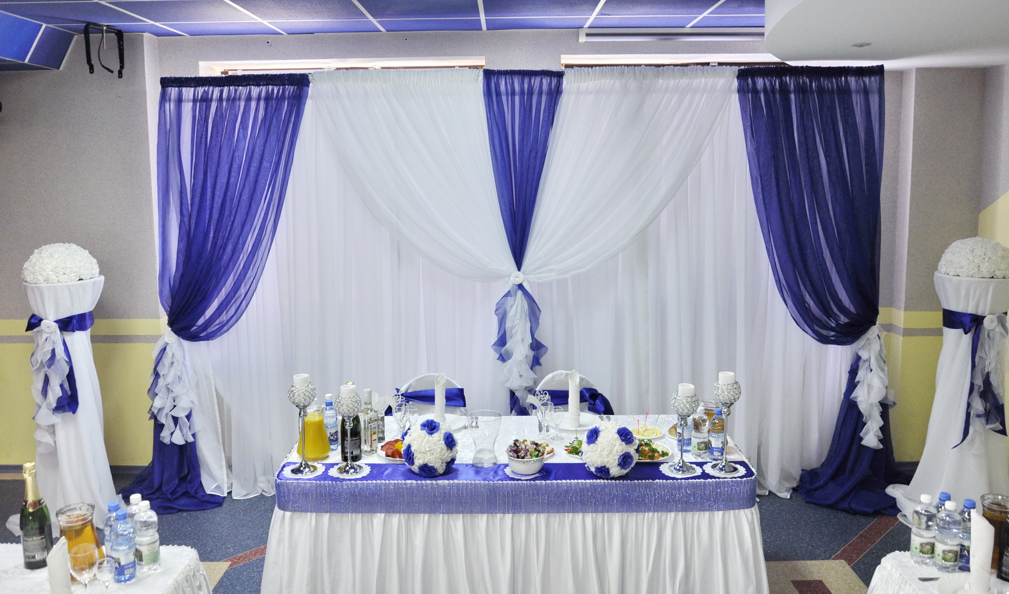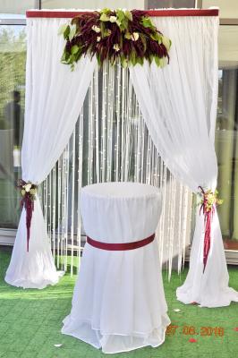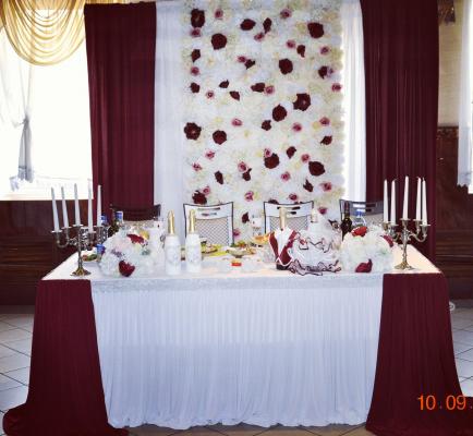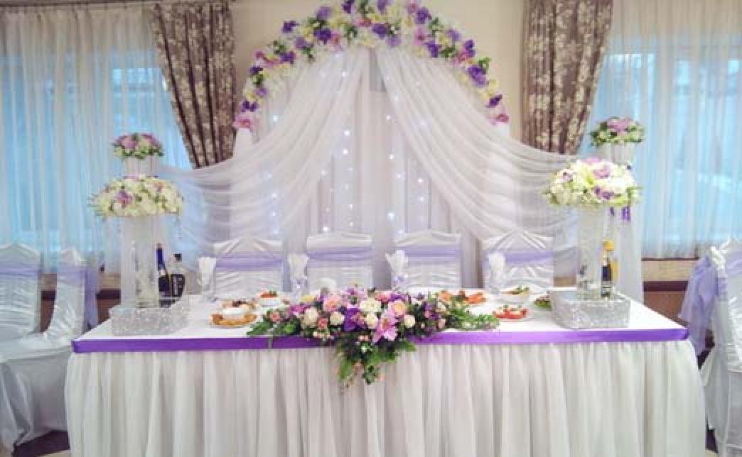 скидку 50% на оформление президиума молодых (ширма: металлическая конструкция, текстиль; стол молодых: юбка из вуали, интерьерные декоративные элементы (искусственные цветы, подсвечники и др.).