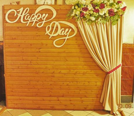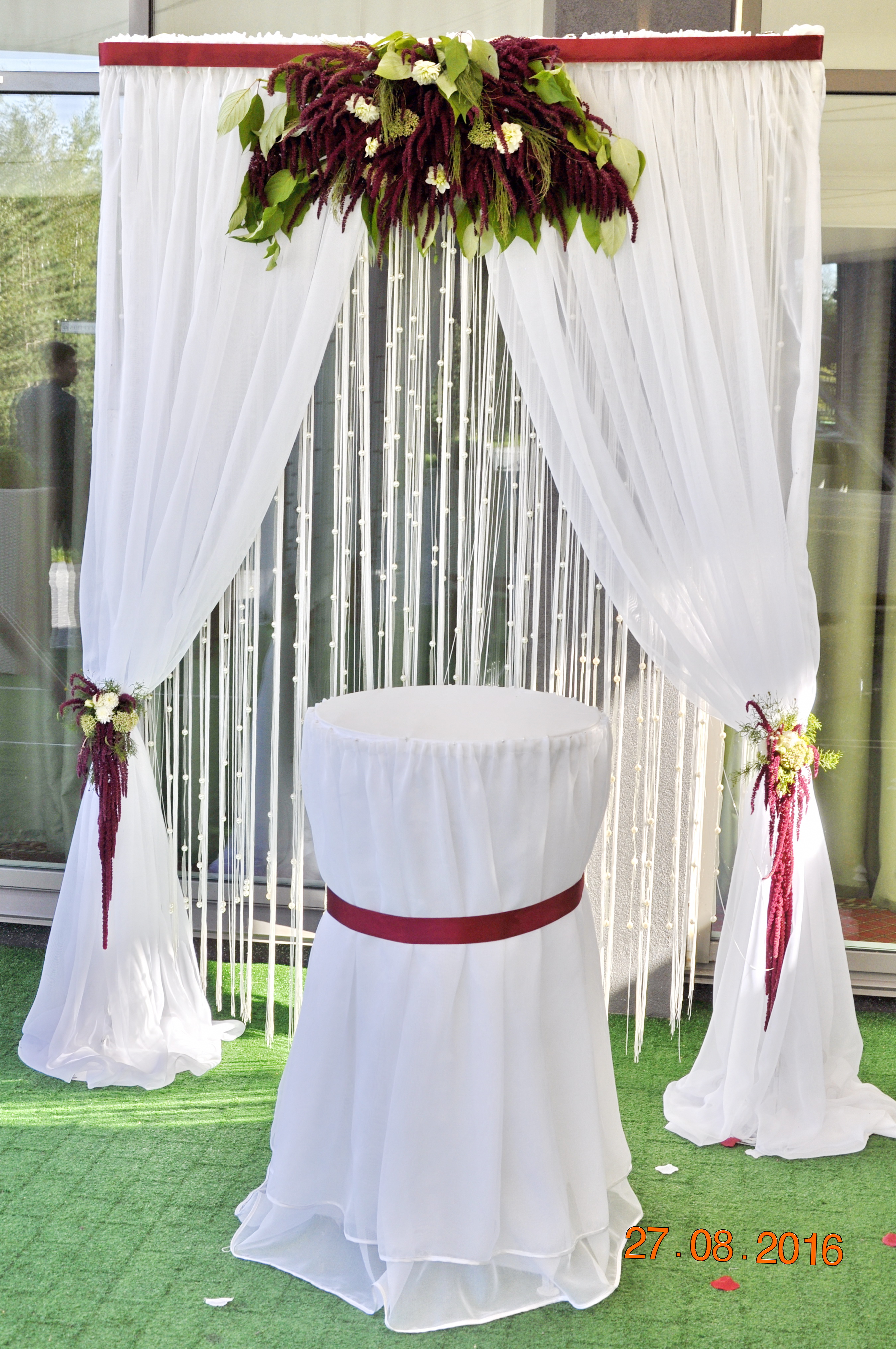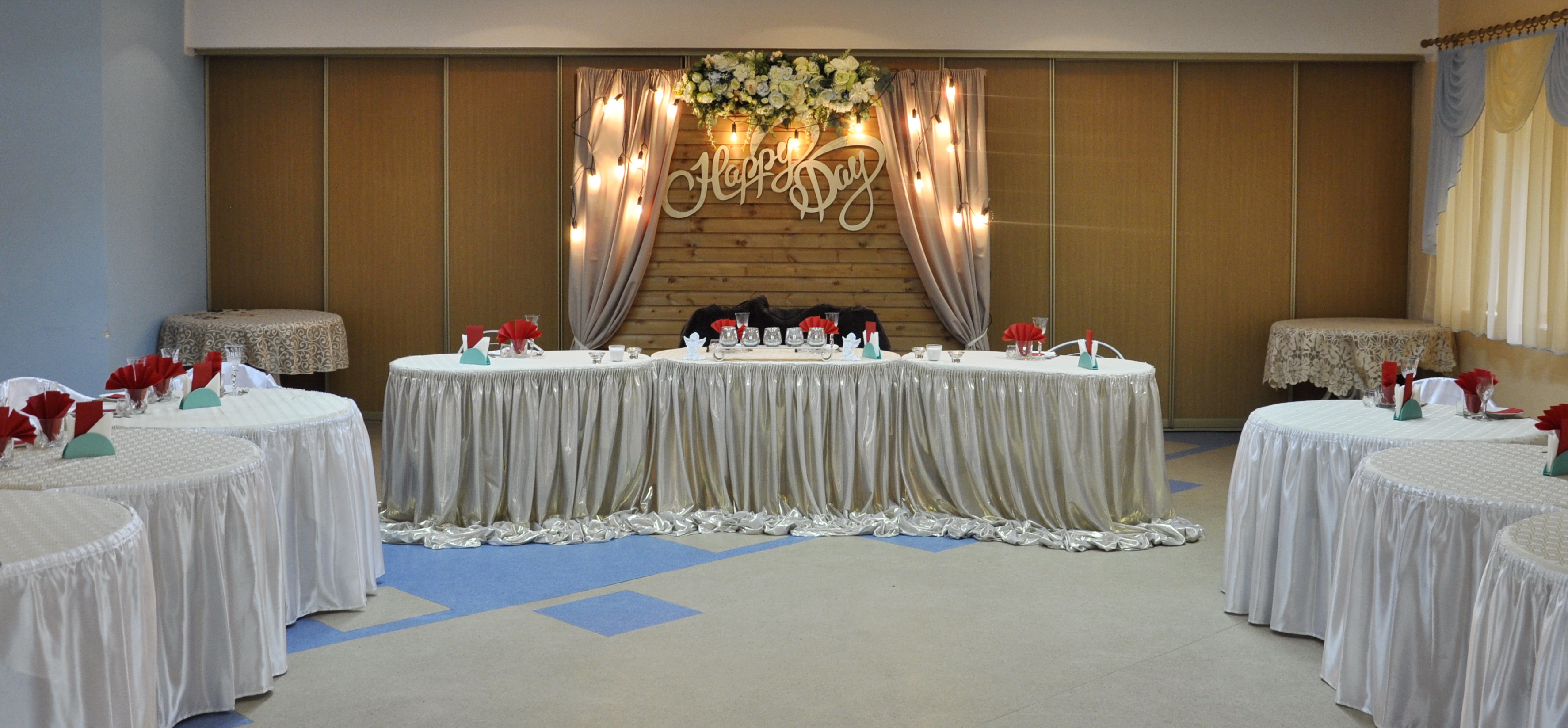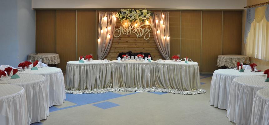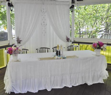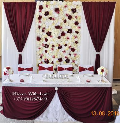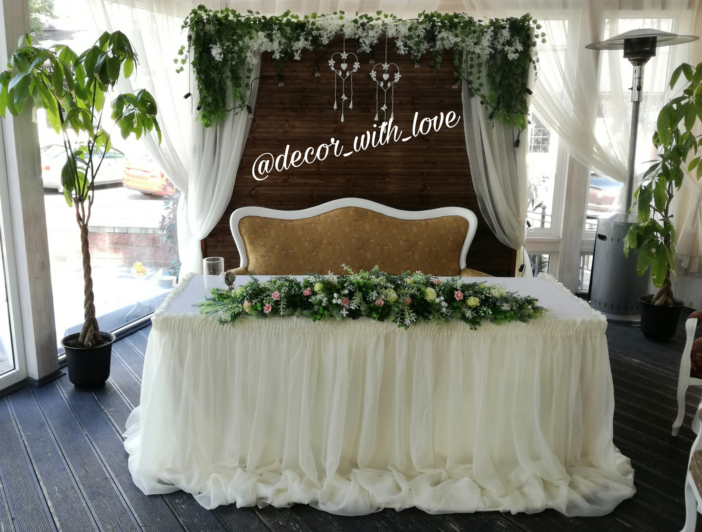 скидку 50% на оформление президиума молодых (ширма: металлическая конструкция, текстиль; стол молодых: юбка из вуали, интерьерные декоративные элементы (искусственные цветы, подсвечники и др.).