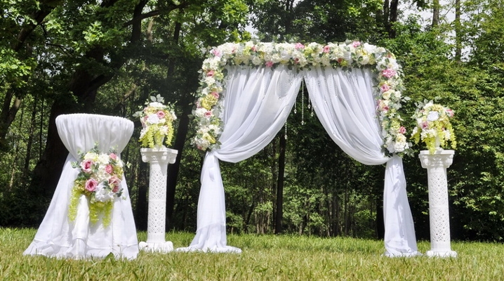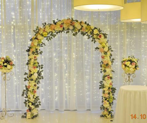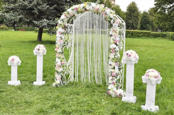 - оформление выездной регистрации (комплект: арка металлическая, текстиль, искусственные цветы, столик для регистратора с оформлением текстилем, стойки /колонны / вазы с цветочными композициями из искусственных цветов) + именная деревянная подушечка для колец в подарок: от 315 руб. вместо от 450 руб.