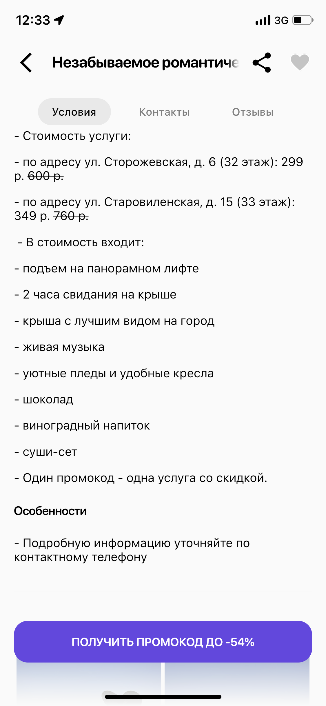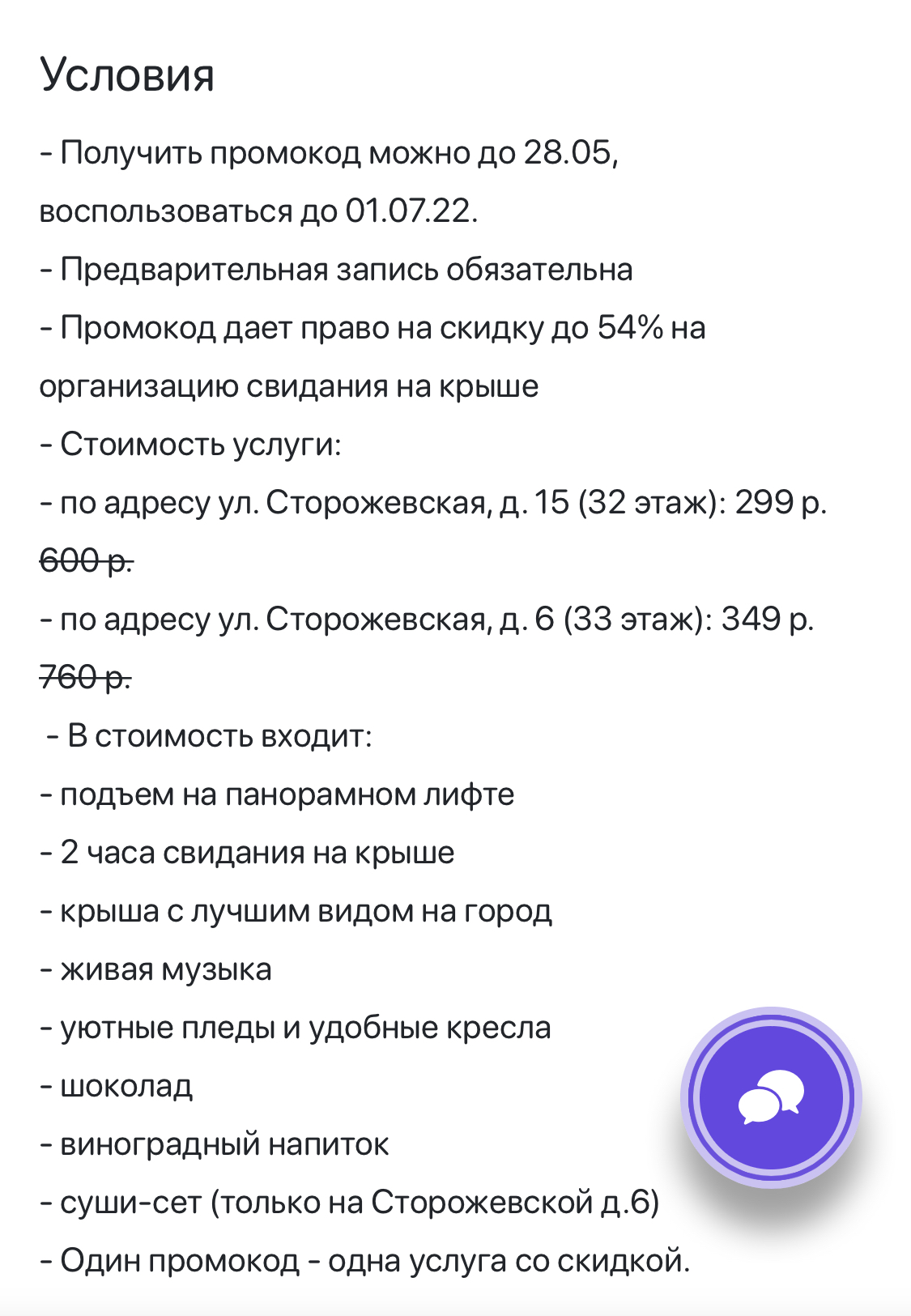 - Промокод дает право на скидку до 54% на организацию свидания на крыше