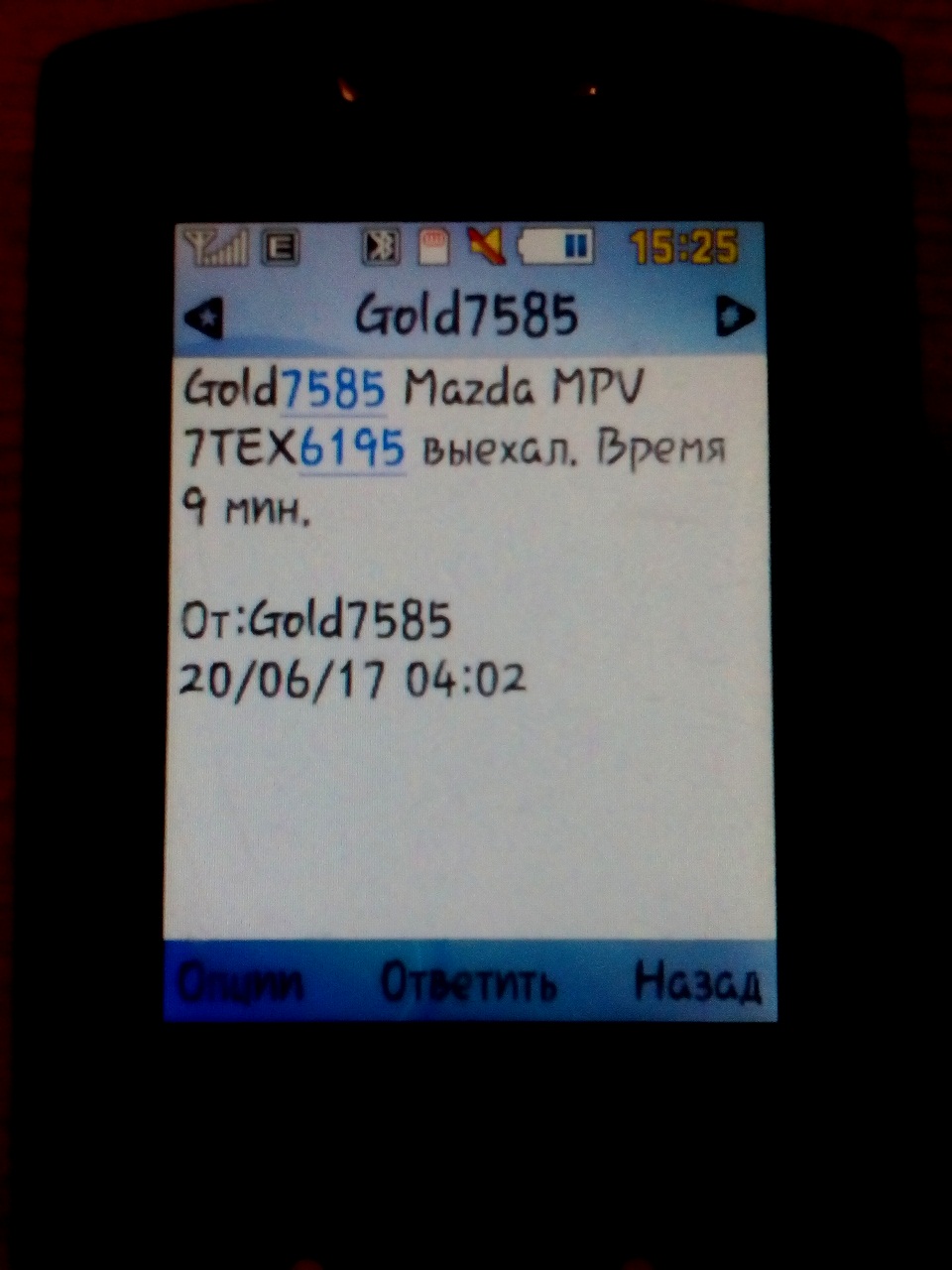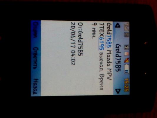 цитирую СМС "смс от Gold 20/06/17 04:02 Gold7585 Mazda MPV 7TEX6195 выехАЛ. Время 9 мин."