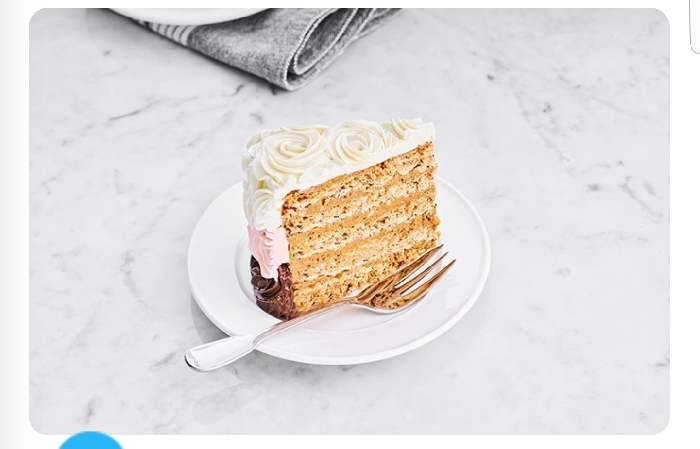 Ароматный слой свежевыпеченного морковного бисквита с грецкими орешками деликатно покрыт нежной прослойкой заварного ванильного крема |