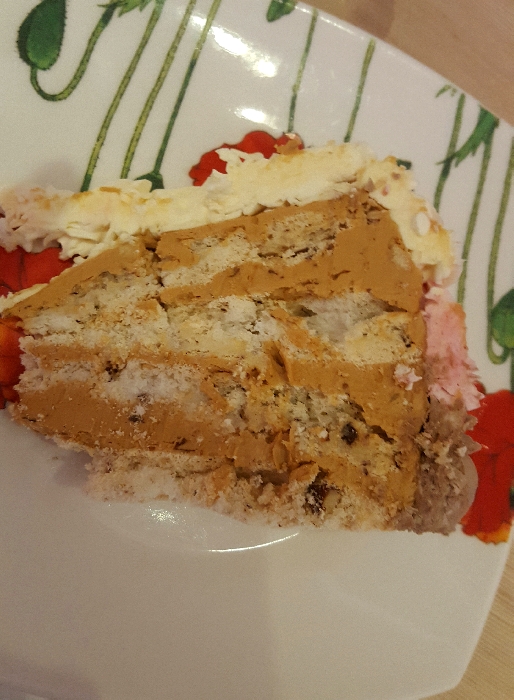 Ароматные кексовые коржи с грецким орехом и маковые коржи поочередно прослоены нежным кремом на основе масла, сгущенного молока и грецких орешков |