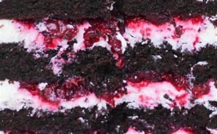 Состав: шоколадный бисквит со сливочным кремом и вишневым конфи, ложка и крышка