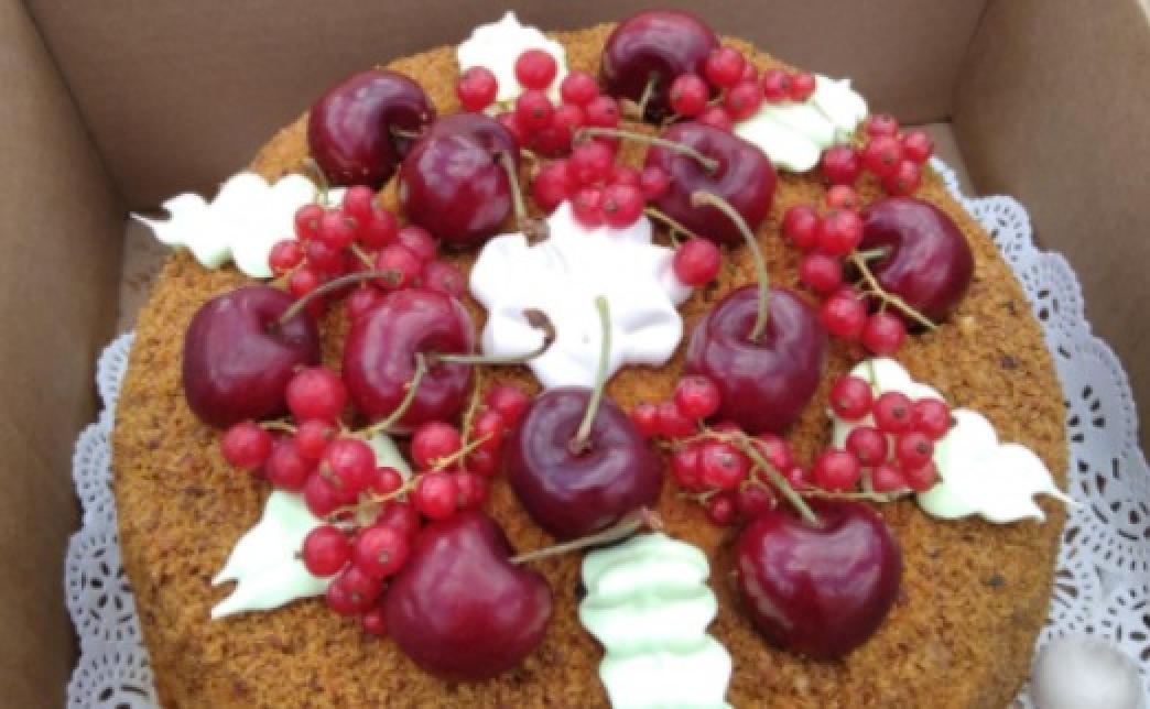 Нежный бисквит с кремом творог-сливки-йогурт, кули из вишни натуральной. Высокий мягкий бисквит 8-10 см, диаметр 20 см. Вес 1500-1942 г.