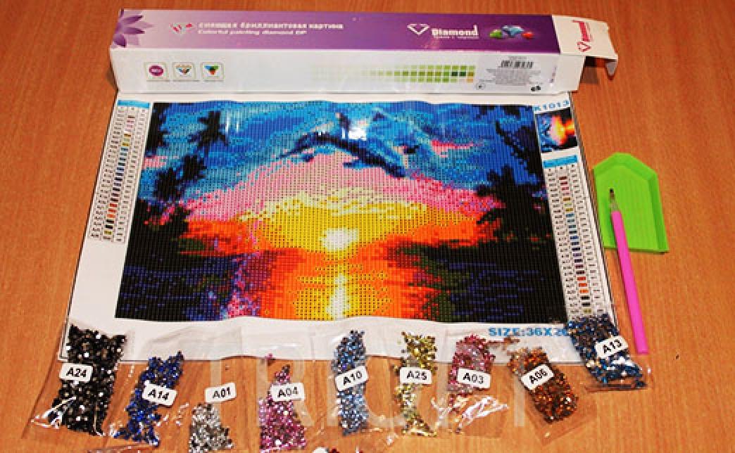 В набор для изготовления картин стразами входят: клеевая основа с нанесенным рисунком, комплект страз разложенных по пакетикам с указанными номерами, специальный карандаш для работы.