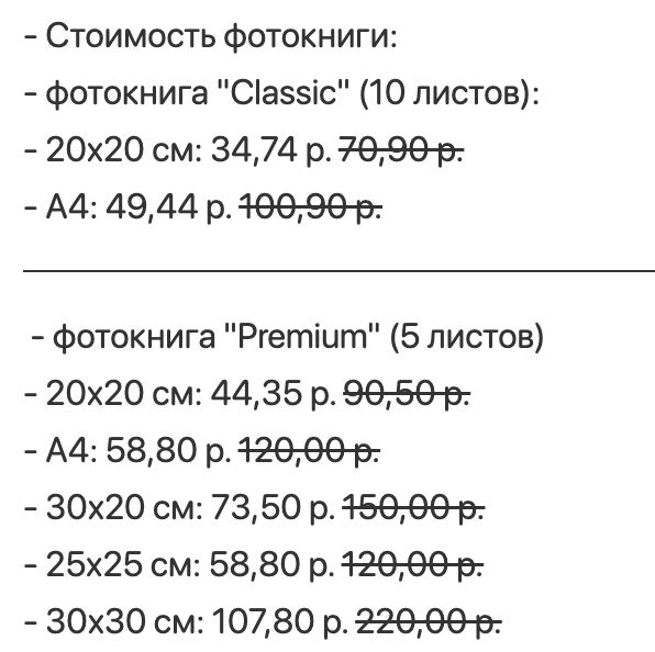 Зря оплатила промокод, на сайте при заказе фотокниги уже есть скидки и промокод дополнительной скидки не дает. Светит зеленым, что промокод применен, но фактически сумма не меняется, что с промокодом, что без сумма остается прежней, не понимаю за что тогда оплата за промокод, пустой получается(