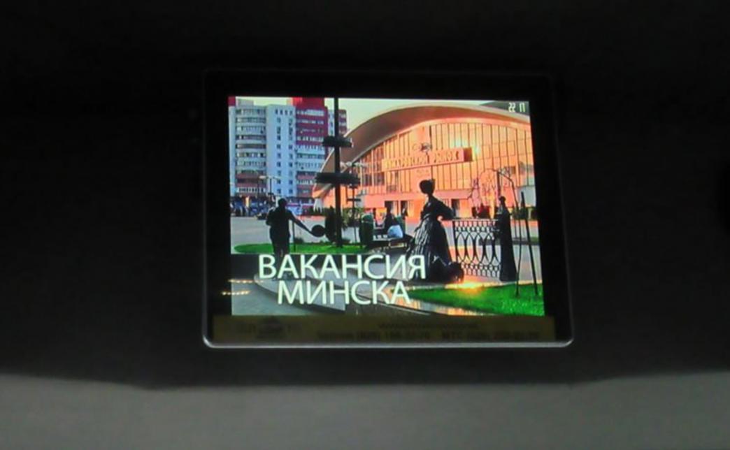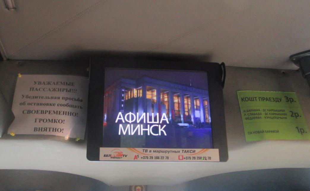 - Рекламно-информационные ролики (в формате "видео + звук в фоновом режиме") согласно медиаплана размещаются ежедневно по 16 часов на 17-дюймовых видеоэкранах в маршрутных такси г. Минска