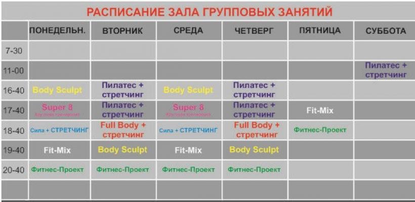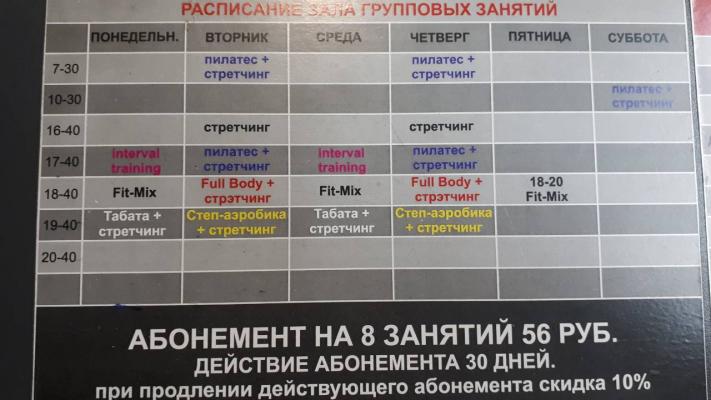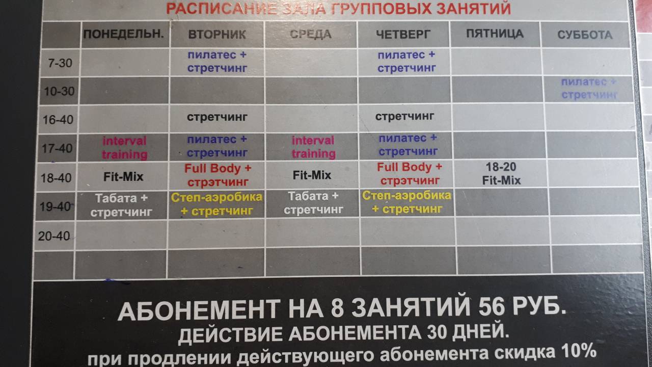 - Аэробика, кардиотренажерный зал, пилатес, силовые классы, степ, стрейчинг, тренажерный зал, фитнес