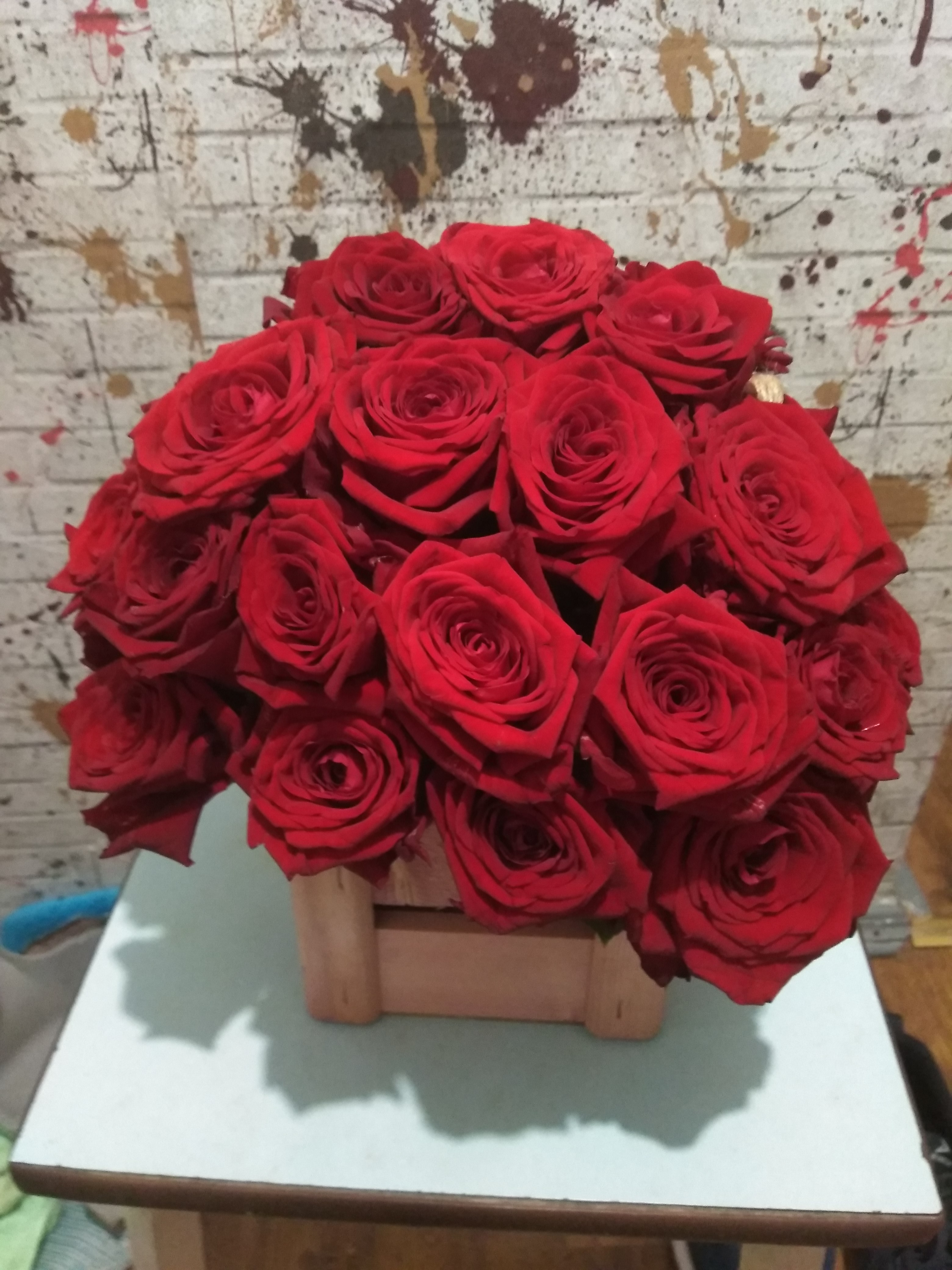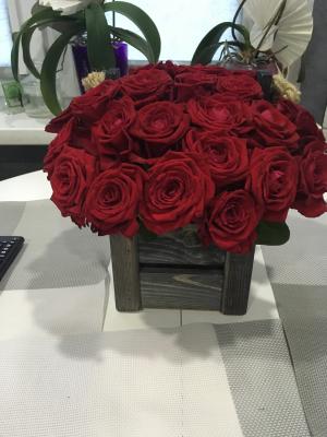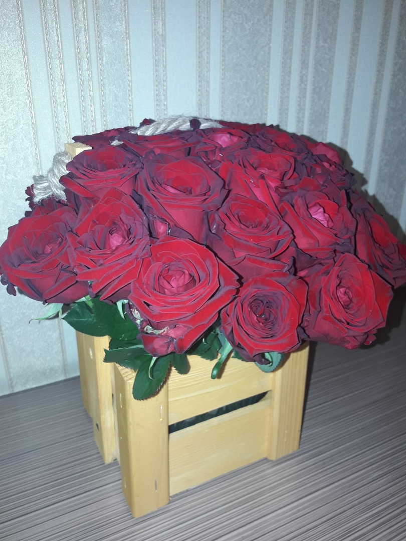 Заказывали эту чудесную композицию подруге на 35 лет. Очень красивый и интересный букет. Именинница осталась довольна!!! Розы свежие, ящик сделан качественно и сама идея оформления очень необычная и оригинальная! Смотрится богато и притягивает взгляды. Привезли во время. Будем заказывать ещё! Покупкой довольны Спасибо магазину за такую красоту по доступной цене