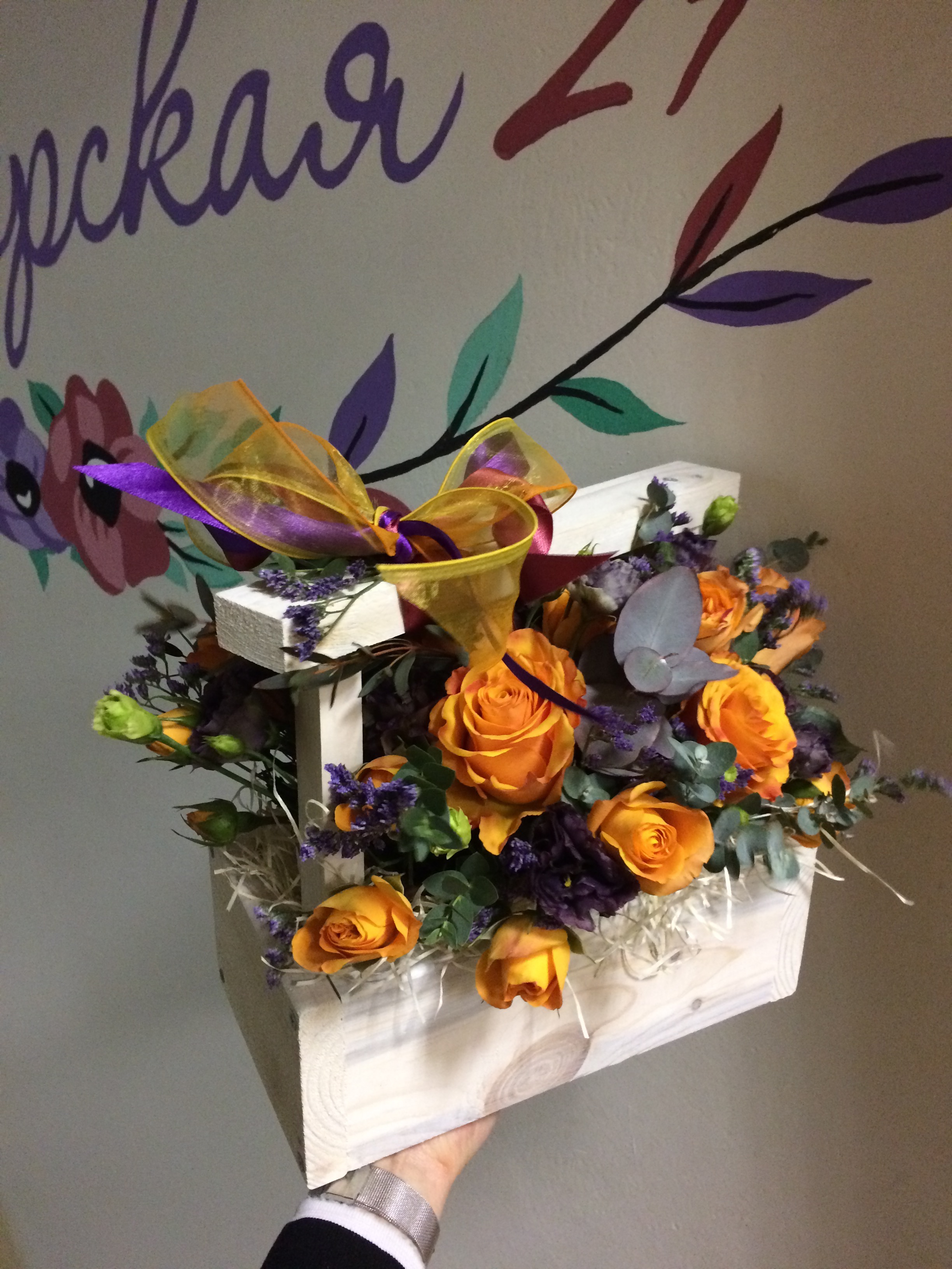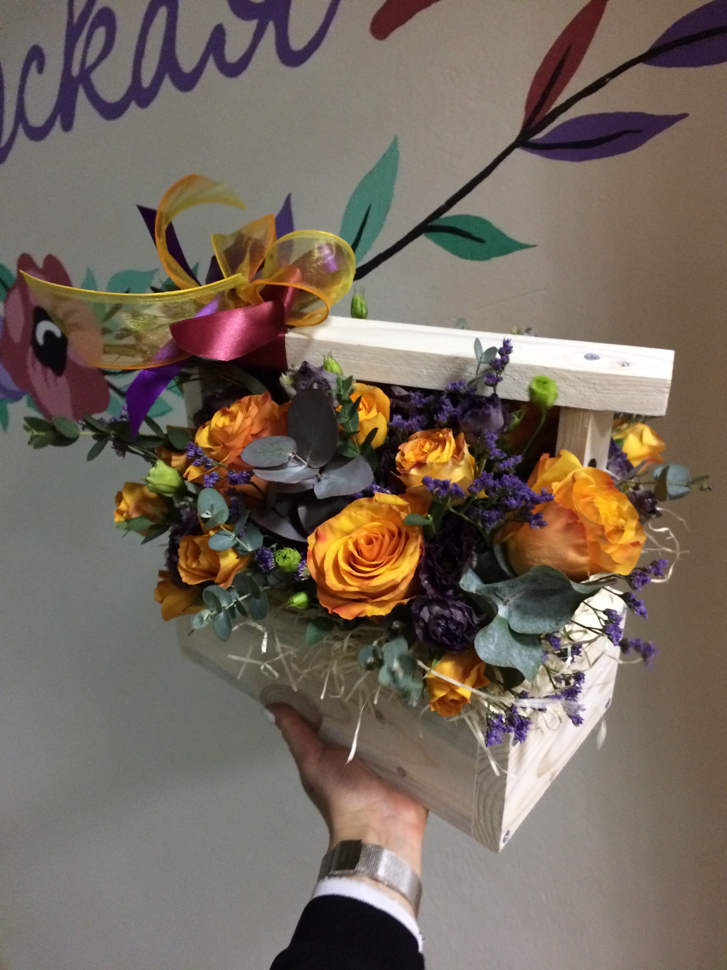 - Один промокод - одна деревянная/шляпная коробочка с цветами или букет со скидкой.