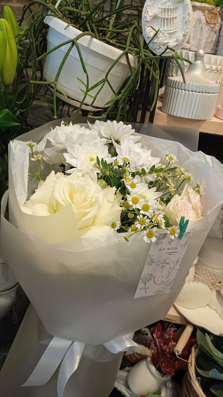 Состав: роза французская, хризантема, роза кустовая, танацетум, зелень, упаковка