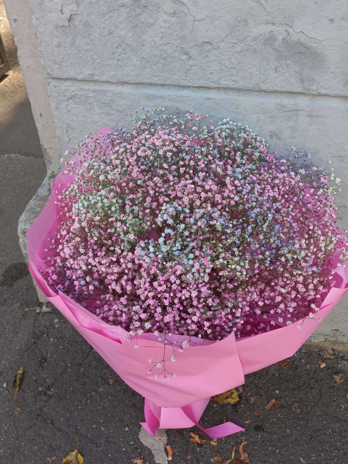 - букет из гипсофилы (белая, розовая, голубая ) + упаковка: