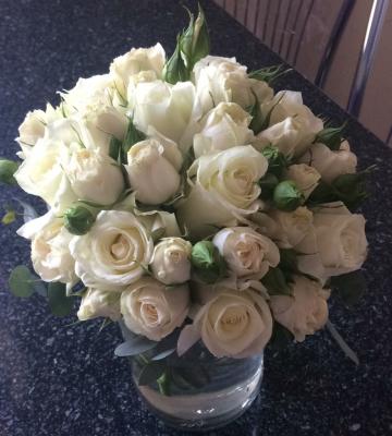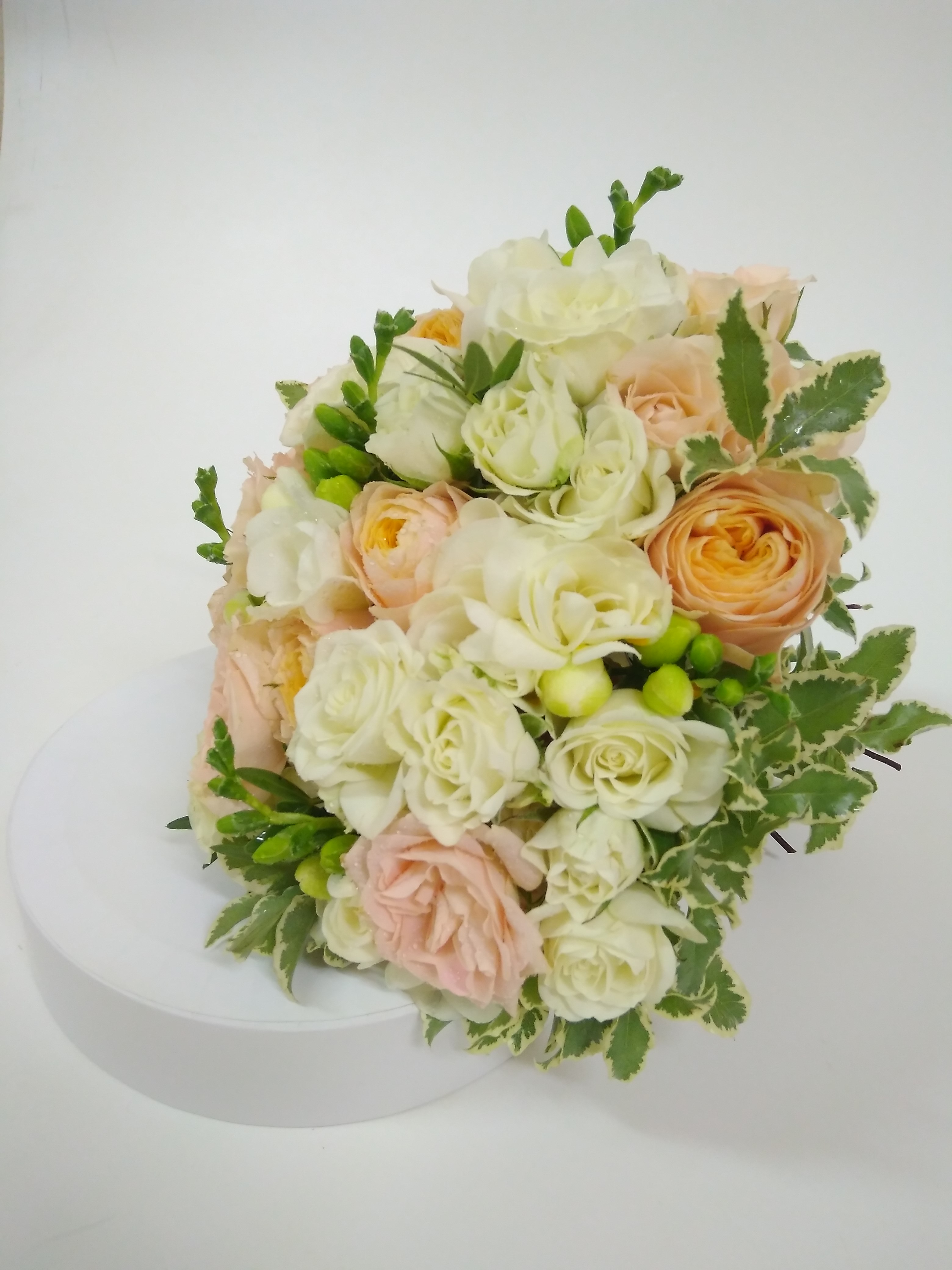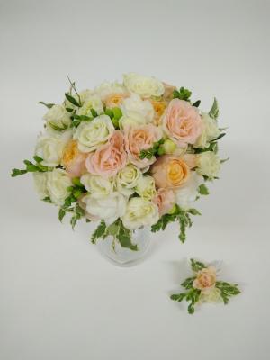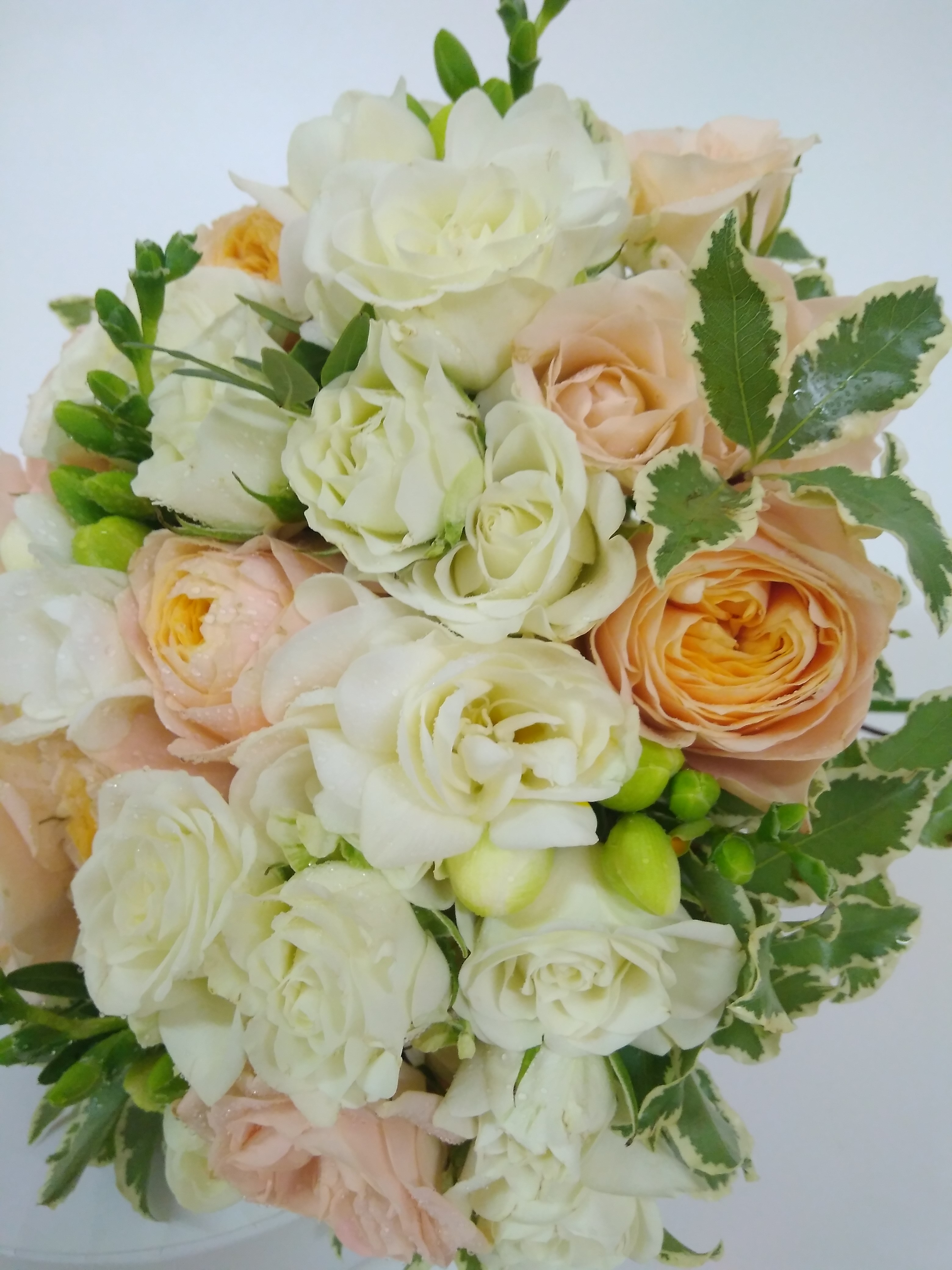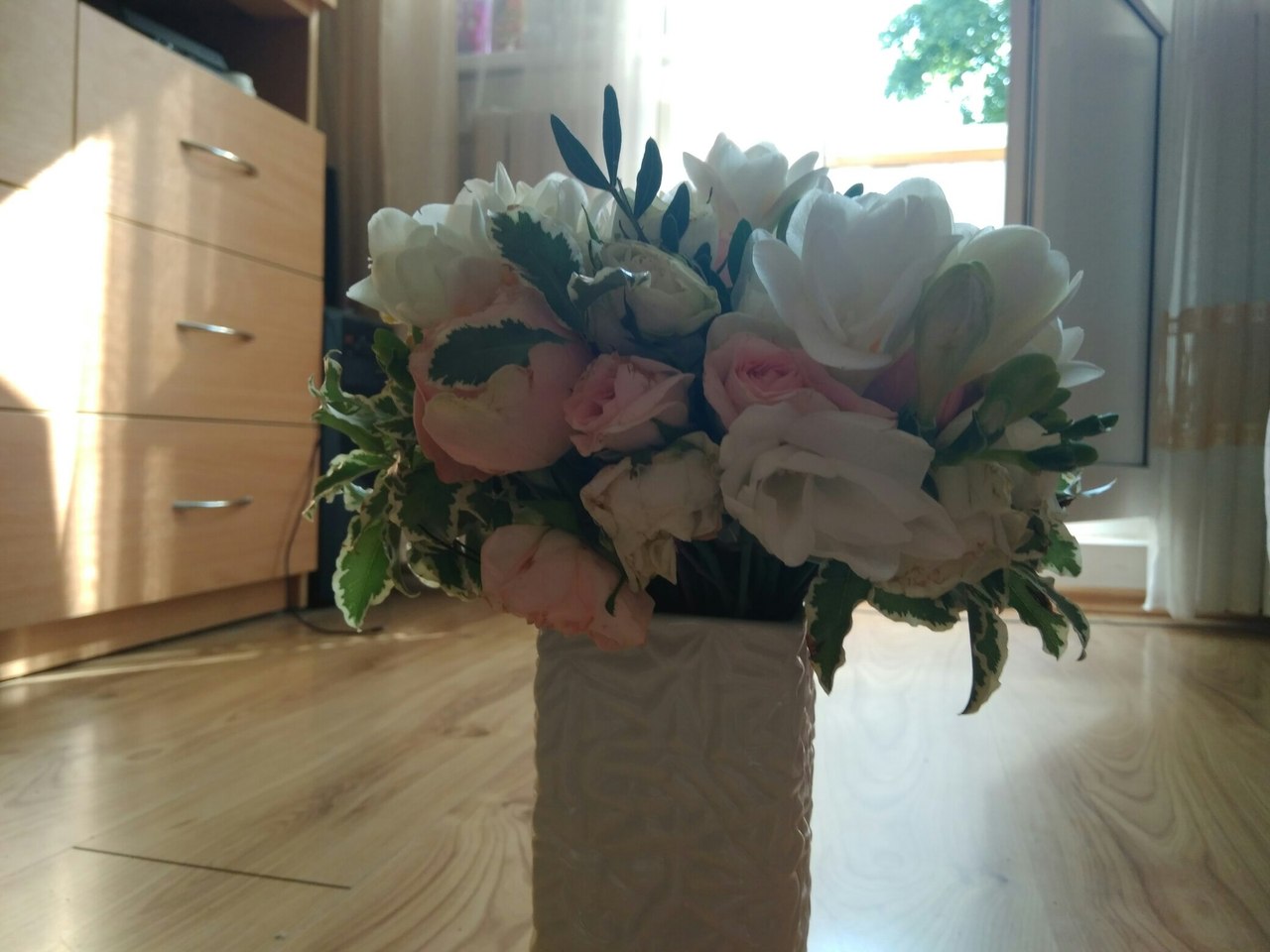 Вот фото букета и бутоньерки, сделанные накануне доставки. Свадьба у вас была в 30 градусную жару, все цветы для свадебного букета привозим за один день до составления букета. Поэтому причина такого поведения цветов связана с погодой, в качестве цветов мы не сомневаемся .