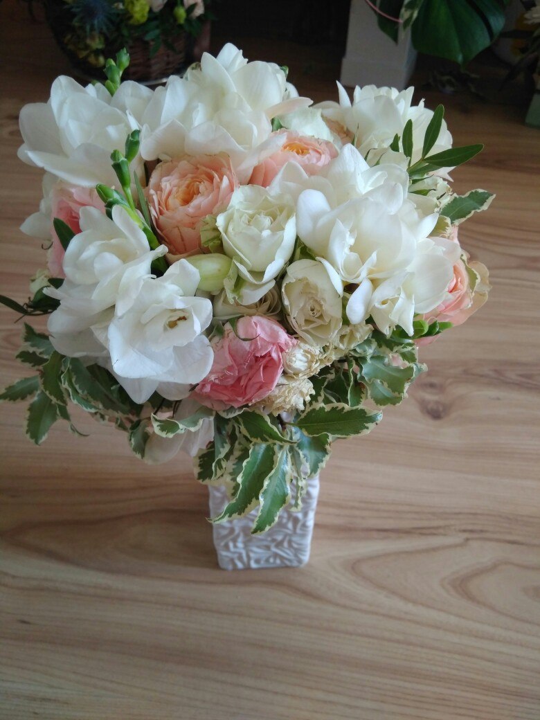 Заказывала у moreroz.by свадебный букет номер 5 и дублер, бутоньерку как и обещали дали в подарок))) Букет получился очень нежный и ароматный. Также очень понравилась девушка флорист, тем что учла все мои пожелания вплоть до мелочей! Букет жених забирал сам, в дорогу сделали для букета вазу из пленки, чтобы цветочки были в воде!!! Обслуживание мне очень понравилось, сроки выдержаны, всем рекомендую!!!