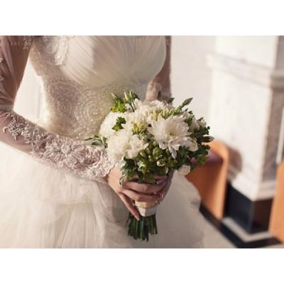 По акции вы можете приобрести только букет невесты из представленных здесь или букет невесты, состоящий из цветов, которые можно приобрести по акции. На нашем сайте представлены другие наши работы и стоимость. Также можем повторить любой букет по вашей картинке или по запросу. В данном букете на фото по акции считаем только хризантемы (3.50 руб. вместо 4.50 руб.). Эустома и фрезия без акции. Таким образом, примерная стоимость букета на сегодня: 73.00 руб.