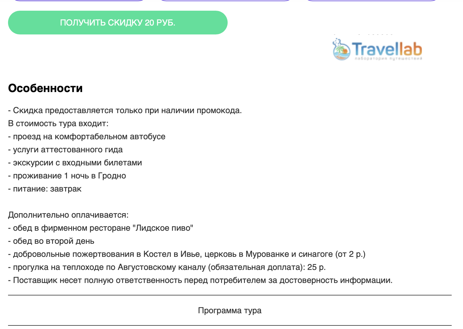 - Промокод также дает право на скидку 20 р. на тур "Выходные в Гродно"