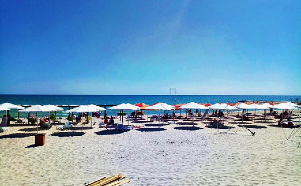Удачное расположение пансионата позволяет отдыхающим в течение нескольких минут добраться до набережной и оборудованного зонтиками и шезлонгами широкого песчаного пляжа с пологим входом в море.