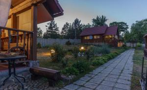 Экстерьер усадебного комплекса приятен глазу в любое время суток. Рассматривая каждый его уголок, невозможно не отметить место для посиделок у костра, чем-то напоминающее мини-амфитеатр. Повсюду стоят фонари, клумбы с цветами и садовыми фигурами, деревянные арки, украшенные гирляндами, стены домов в росписи, выкопан декоративный пруд.