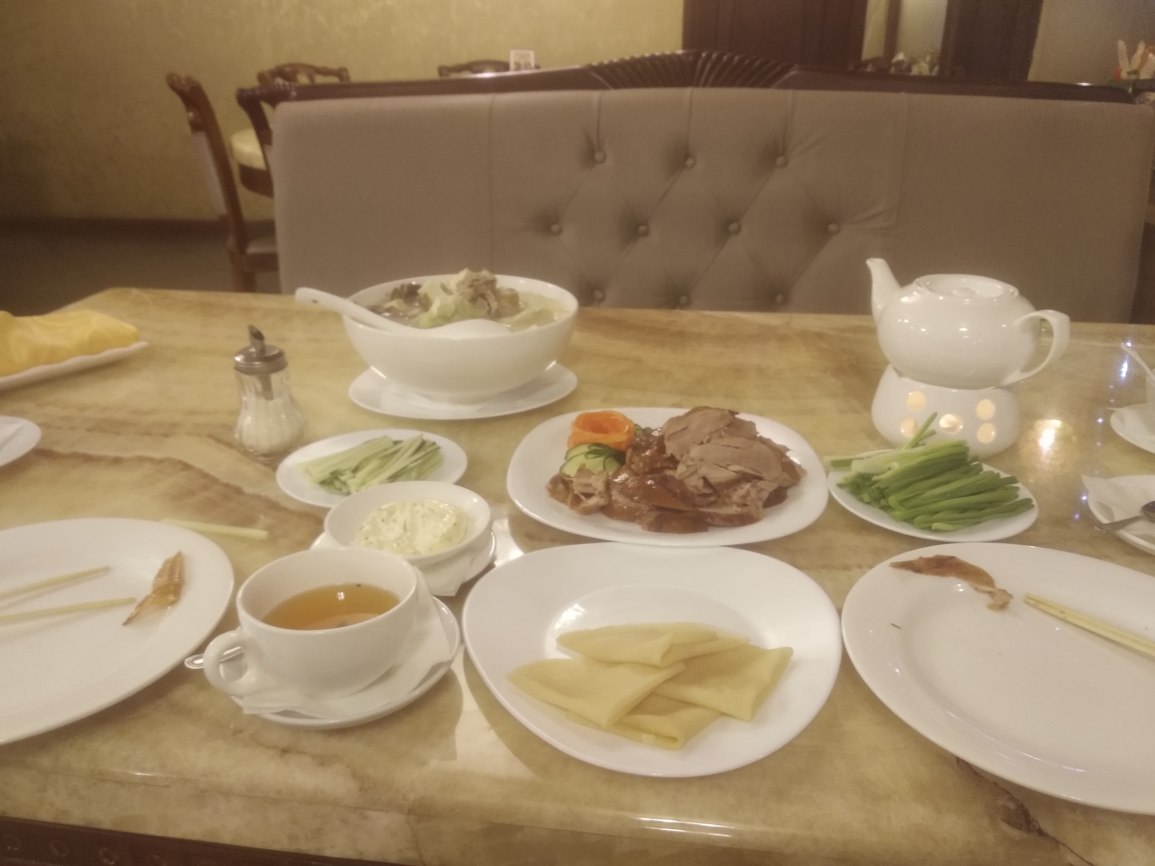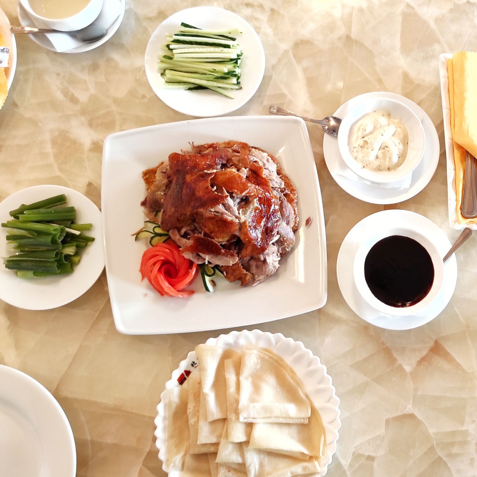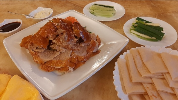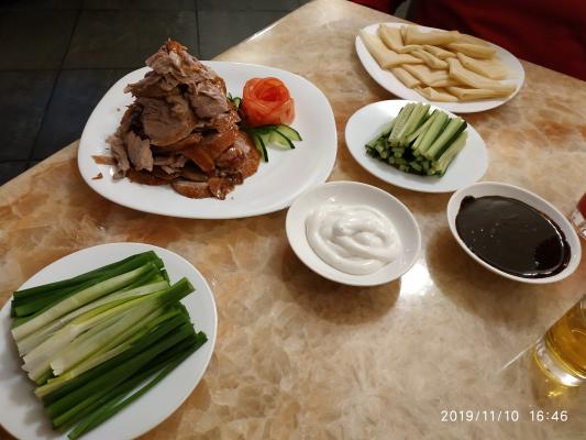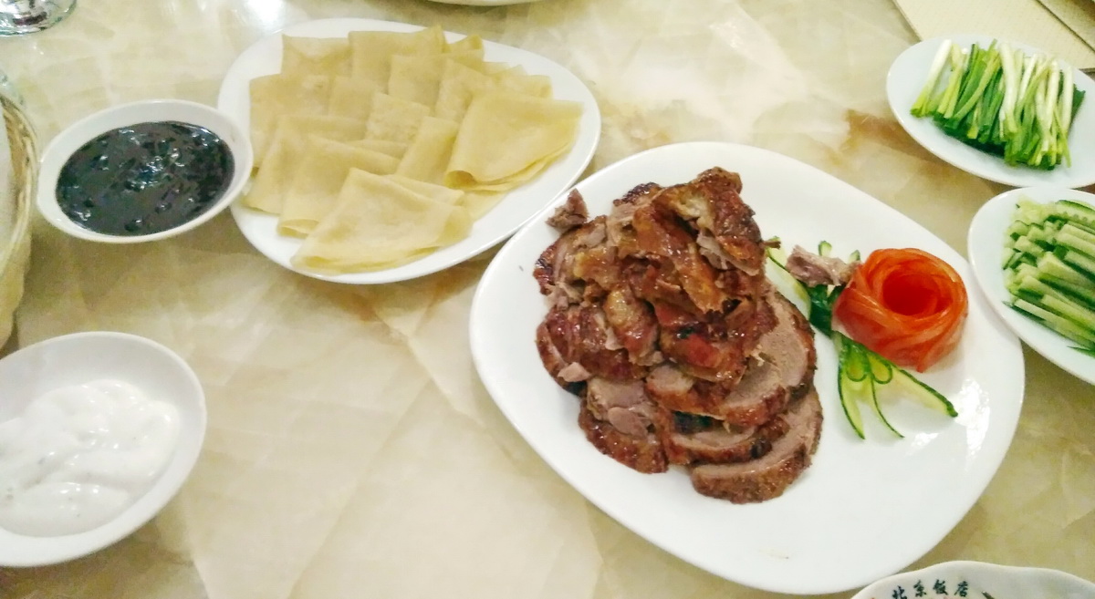 Утка по-пекински представляет собой натертую медом утку, запеченную в специальной печи. Подается с рисовыми блинчиками, зеленым луком, порезанным соломкой огурцом и соусами.