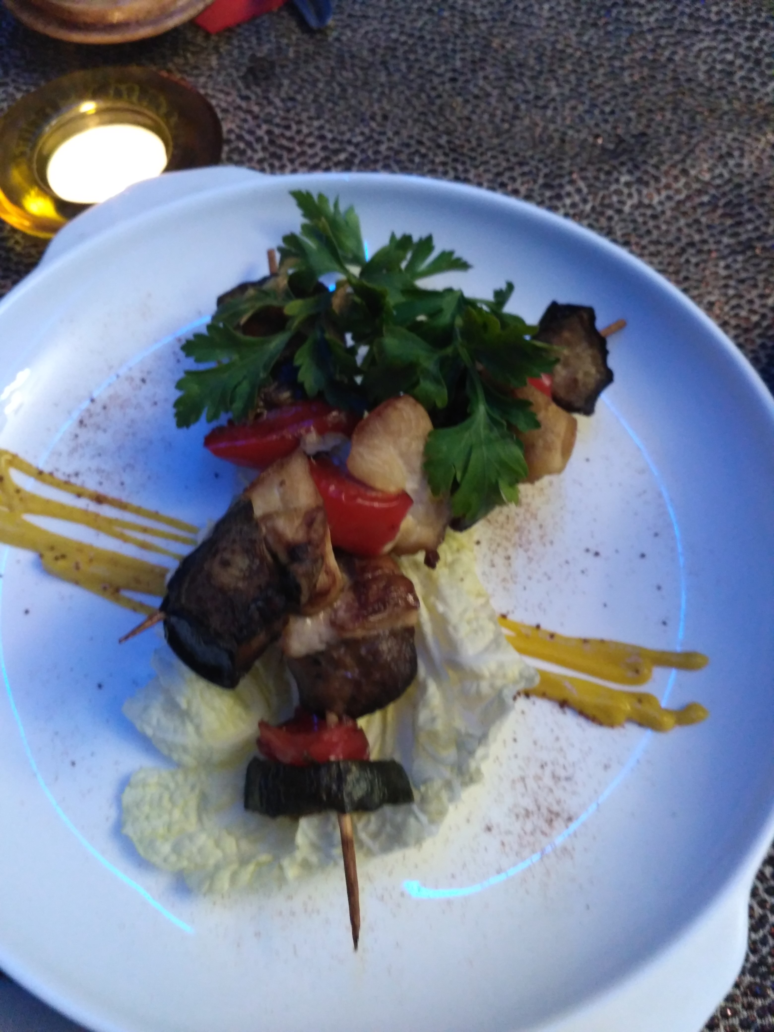 Был будний день, поэтому в заведении,кроме нашего был ещё один столик занят. Официантка очень внимательная, все быстро приносили. Обслуживание ненавязчиво, свечи зажгли под вечер, очень приятно было)