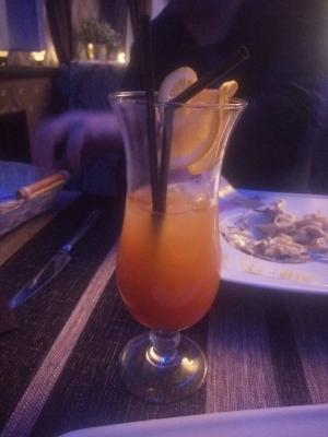 Коктейли там тоже вкусные, прошлый раз брали их фирменный- Сундук, оочень необычный. и объем огромный. Этот раз пила Секс на пляже, соотношение правильное, хорошо чувствуется ликер и клюквенный сок, апельсиновый не перебивает, хотя почти везде в кафе г.Минска льют сплошной апельсиновый сок и он гасит все остальные ингридиенты. Брат брал коньяк, вот он то....не очень.