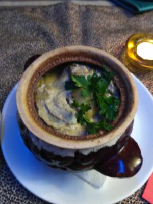 За обед отдали 30 р, а еда оказалась очень вкусной, сытной, порции хорошие, а не как у нас иногда в кафе принесут 120гр. Брали салат теплый и с фасолью, шашлык и говядину в гаршочке. И глинтвейн принесли. Все было красиво подано и очень вкусно. Спасибо, будем приходить ещё!)