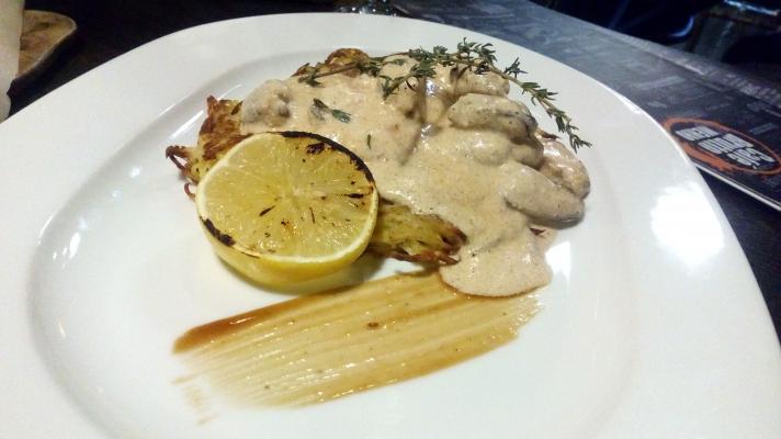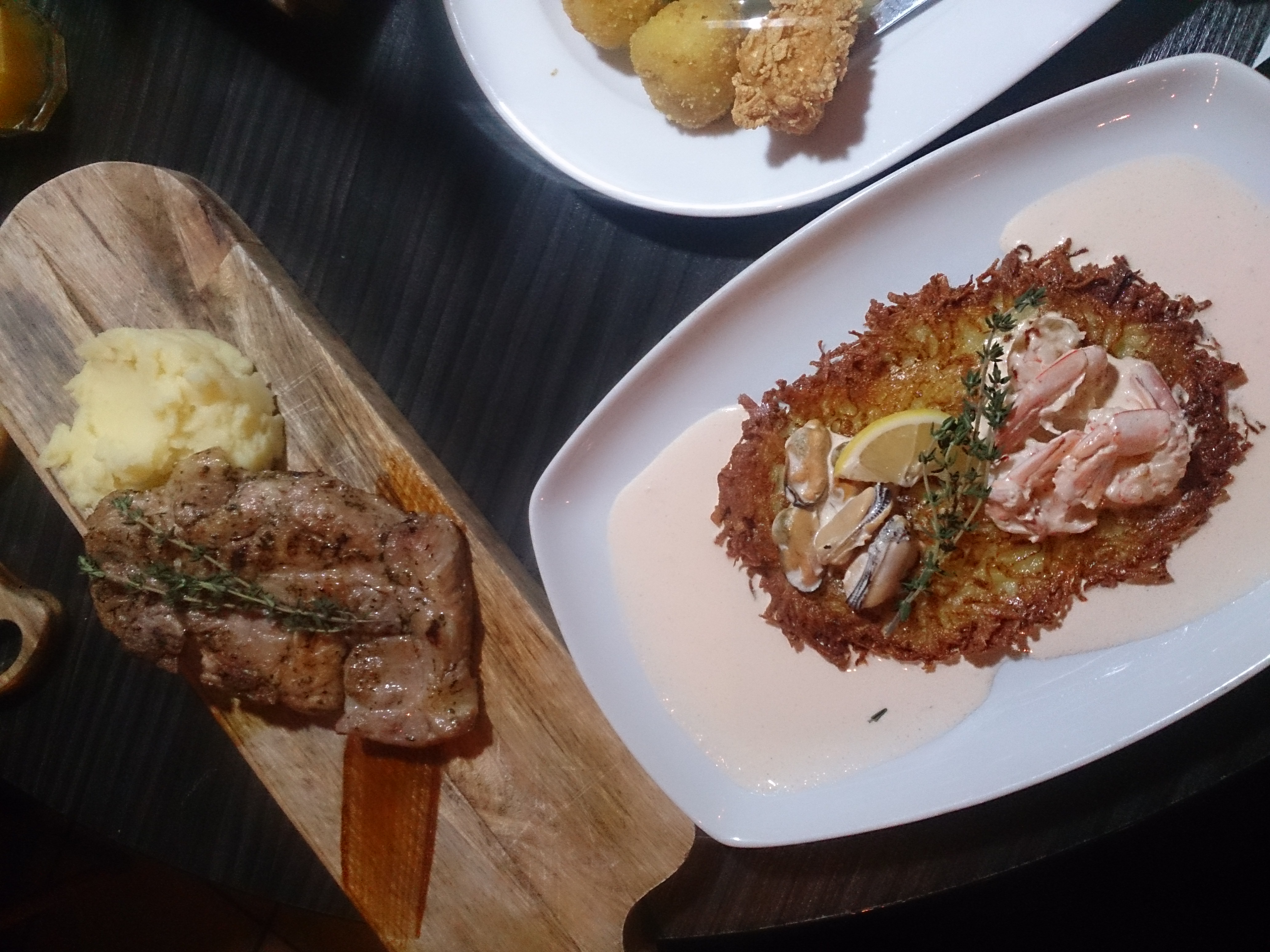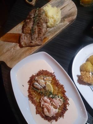 Не обольщайтесь на большой стейк - в нем огромная кость (по крайней мере мне таковая попалась). Пюре просто "шлепнуто" на доску. Креветки плохо очищены от панциря. 4 звезды только за вкусные блюда.