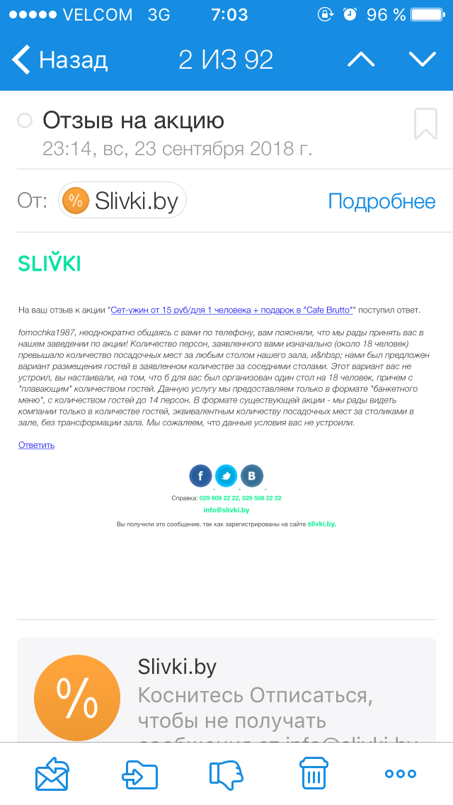 fomochka1987, неоднократно общаясь с вами по телефону, вам поясняли, что мы рады принять вас в нашем заведении по акции! Количество персон, заявленного вами изначально (около 18 человек) превышало количество посадочных мест за любым столом нашего зала, и  нами был предложен вариант размещения гостей в заявленном количестве за соседними столами. Этот вариант вас не устроил, вы настаивали на том, что б для вас был организован один стол на 18 человек, причем с "плавающим" количеством гостей. Данную услугу мы предоставляем только в формате "банкетного меню", с количеством гостей до 12 персон. В формате существующей акции - мы рады видеть компании только в количестве гостей, эквивалентным количеству посадочных мест за столиками в зале, без трансформации зала. Мы сожалеем, что данные условия вас не устроили.