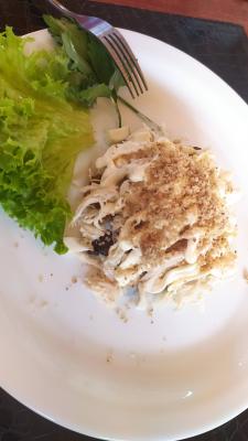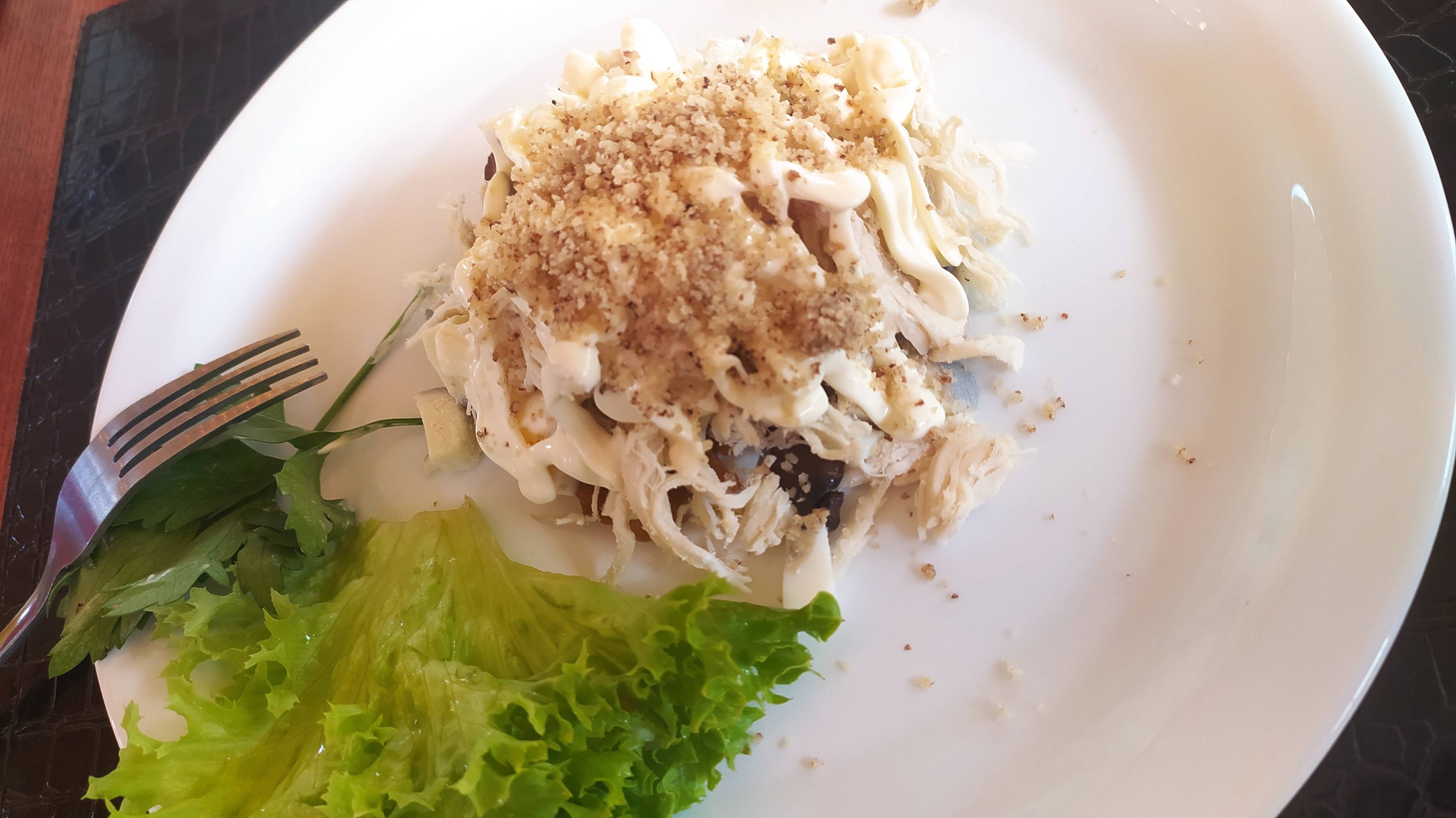 - салат "Римский": куриное филе, салат айсберг, овощи, яйцо, сырно-чесночный соус, сухарики - 260 г/30 г