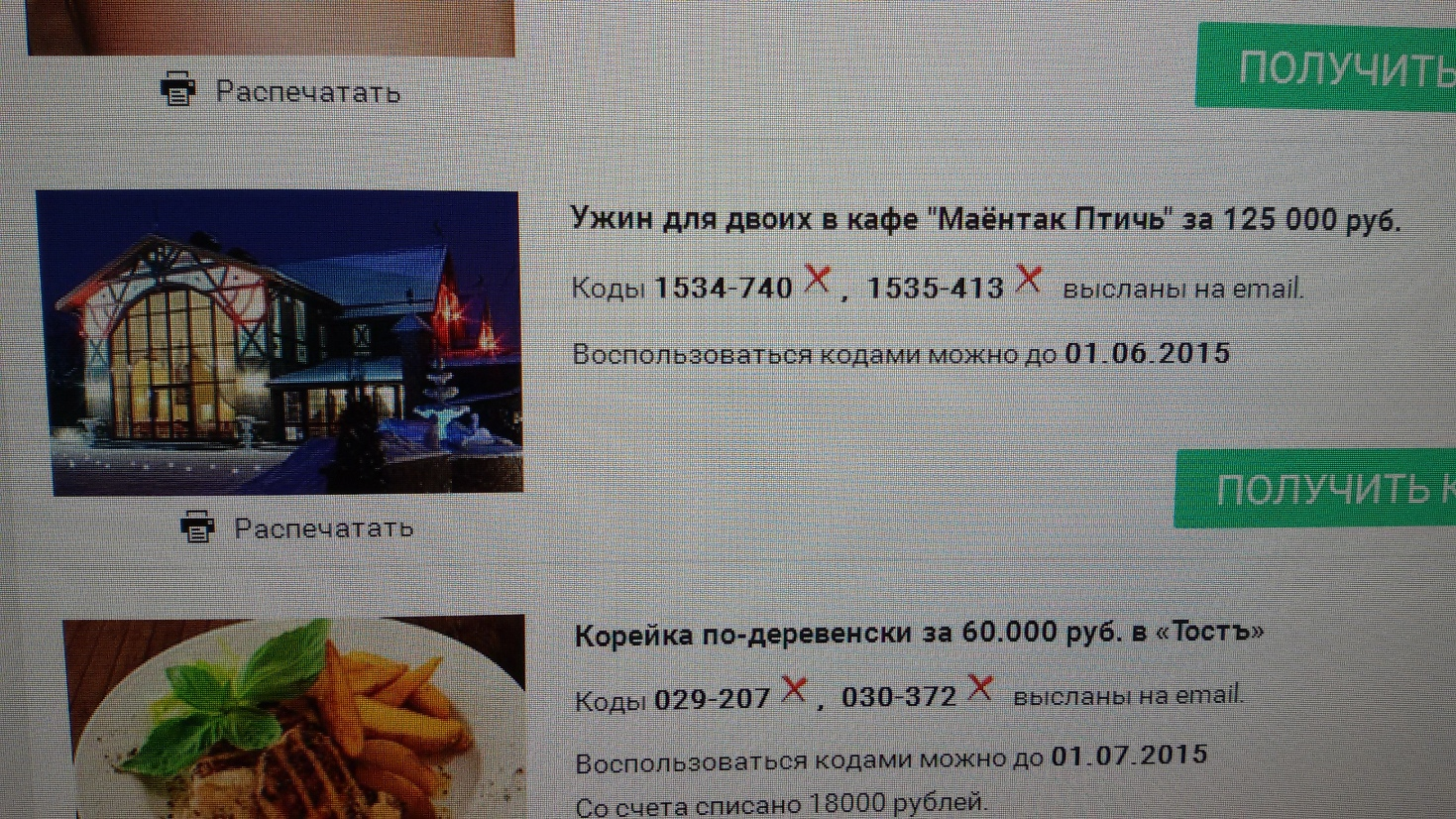 03.04.2015 мною были приобретены 2 кода на ужин в кафе "Маёнтак Птичь". К сожалению, из-за ошибки сайта - неверное отображение срока действия кода - я пропустила срок воспользоваться ими.