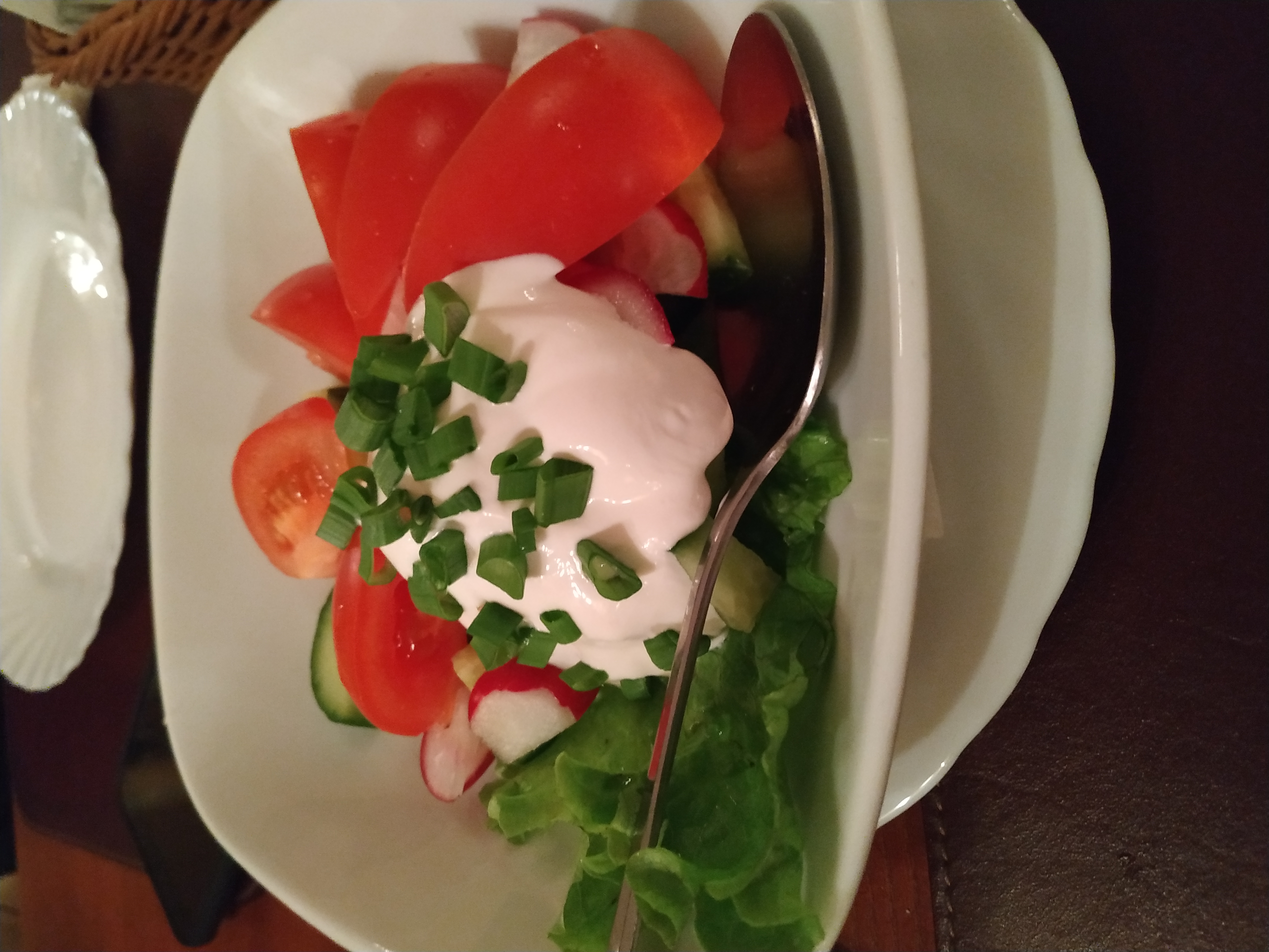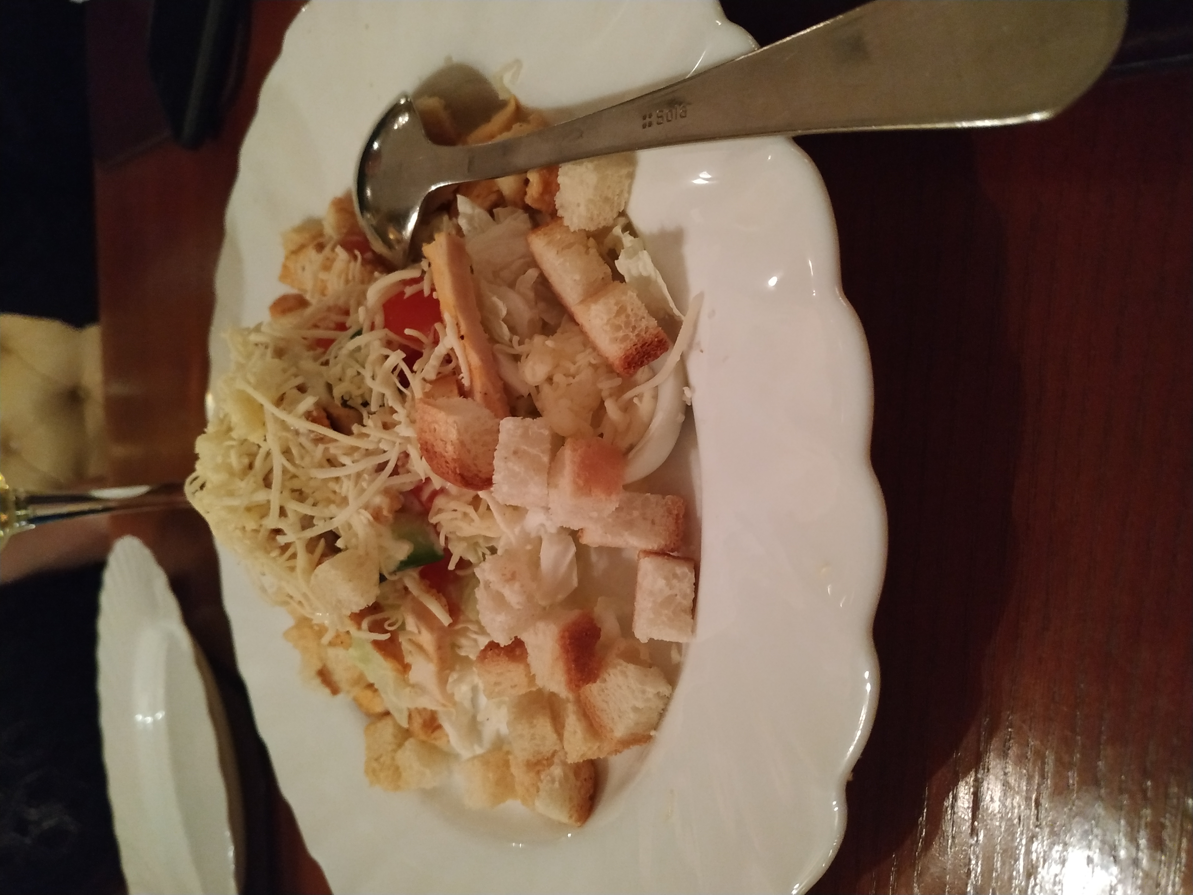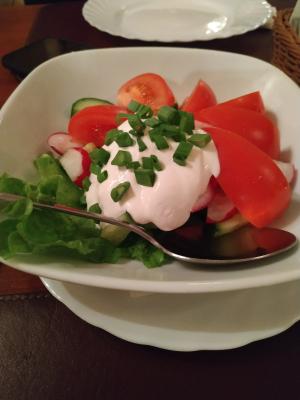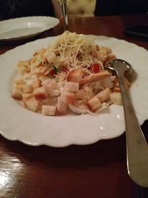 - салат "Римский": куриное филе, салат айсберг, овощи, яйцо, сырно-чесночный соус, сухарики - 260 г/30 г