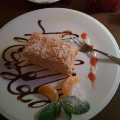 15.01.18 посетители с парнем ваше кафе,были очень удовлетворены! Отношение к посетителям, очень бережное , официант очень ответственный и не навязчивый ( таким хочется оставить чаевые)! Блюда ,реально очень Большие, очень сытные, все настолько вкусно))блюда проносились быстро и в горячем виде! Ну а напалеон, это сказка, такого я ни ела ни где! Вообще всем советует это заведение, останетесь напольными и сытымм:)