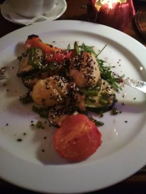 Теплый салат из печеных овощей с рукколой и соусом с кедровыми орешками (180/15/10/1)