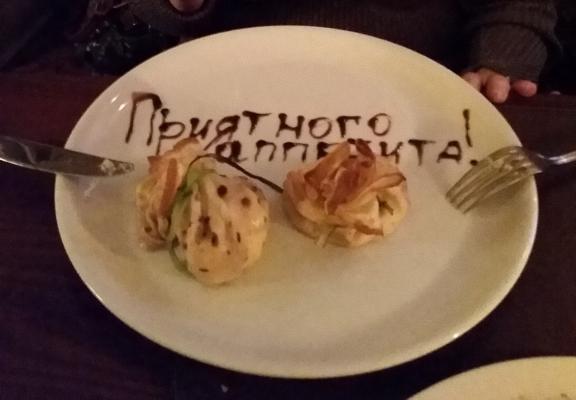 Заказали ужин №2, официанты очень тактично уточняли наши пожелания и вообще обслуживание очень понравилось - тонко и ненавязчиво.