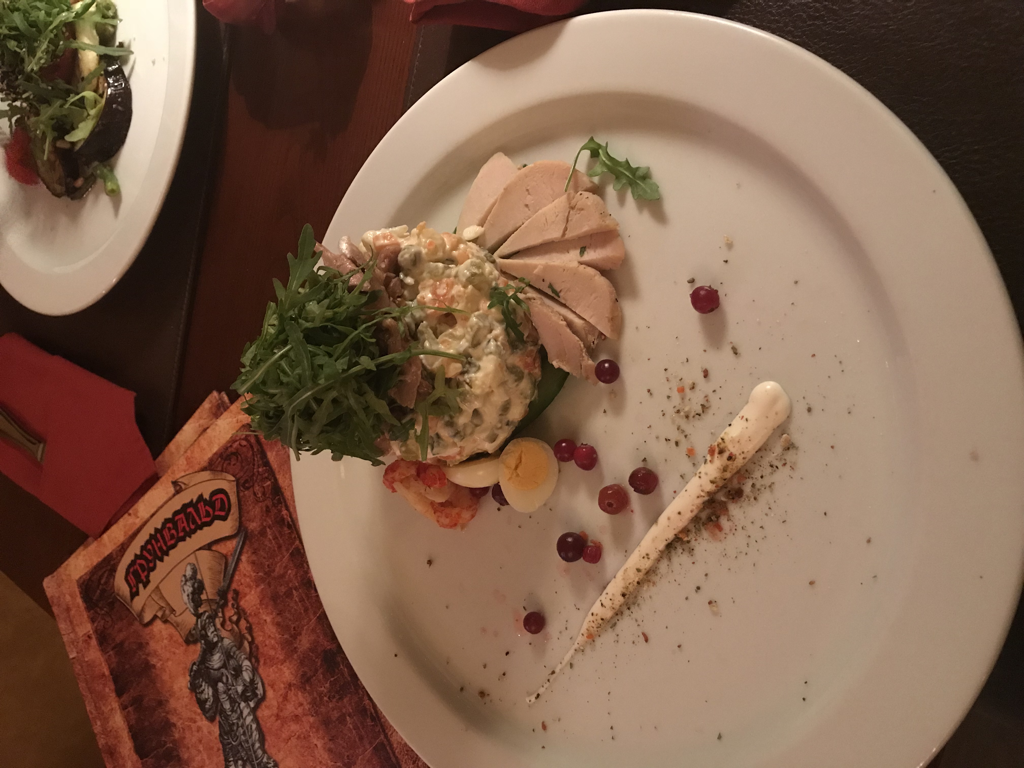 Добрый вечер! Вчера праздновали в кафе "Грюнвальд " день рождения мужа, нас было четверо (двое взрослых и двое детей 12 и 8 лет) . Брала 4 промокода и оба варианта ужина. Я бронировали столик у камина за день до события у администратора Бажены. Приехали, нас встретил администратор Сергей(другая смена) . Он нас и обслуживал. Оба зала были заполнены и при этом салаты нам подали уже через 20-25 минут. Порции огромные. Очень вкусно, особенно тёплые Салаты! Затем принесли горячее. Мясо нежное, сочное, рис потрясающий. А блинчики))) супер!!! Мы вышли прогулялись с детьми перед десертом. Десерты красивые и очень вкусные. Именинник отдельный респект передал за "Наполеон ". А то, что дети не осилили нам упаковали с собой. Мы во многих местах побывали, но могу Вас уверить - это был потрясающий ужин!!! Спасибо всему коллективу за проведённое у Вас время! Обязательно ещё вернёмся и будем рекомендовать друзьям.